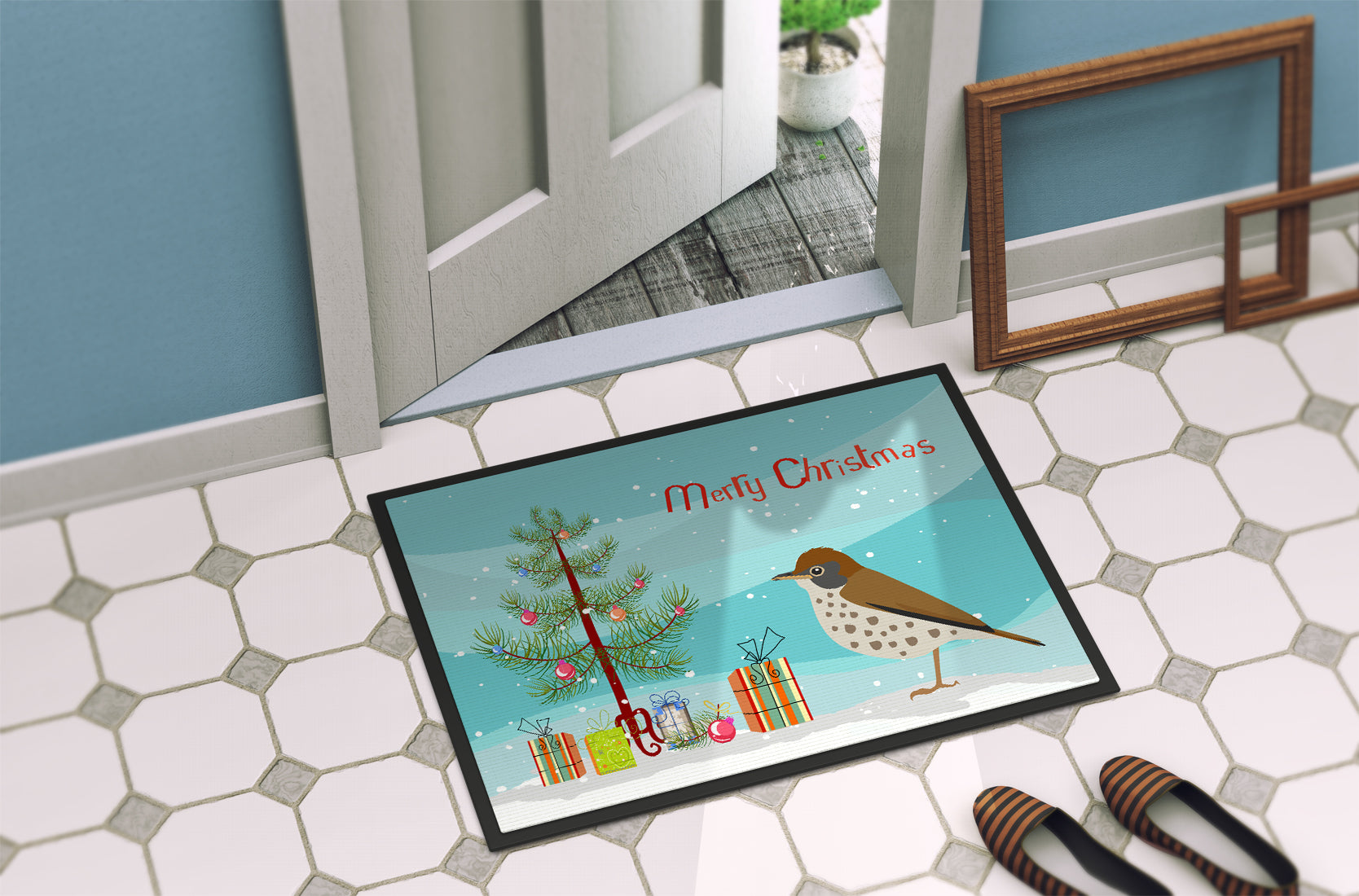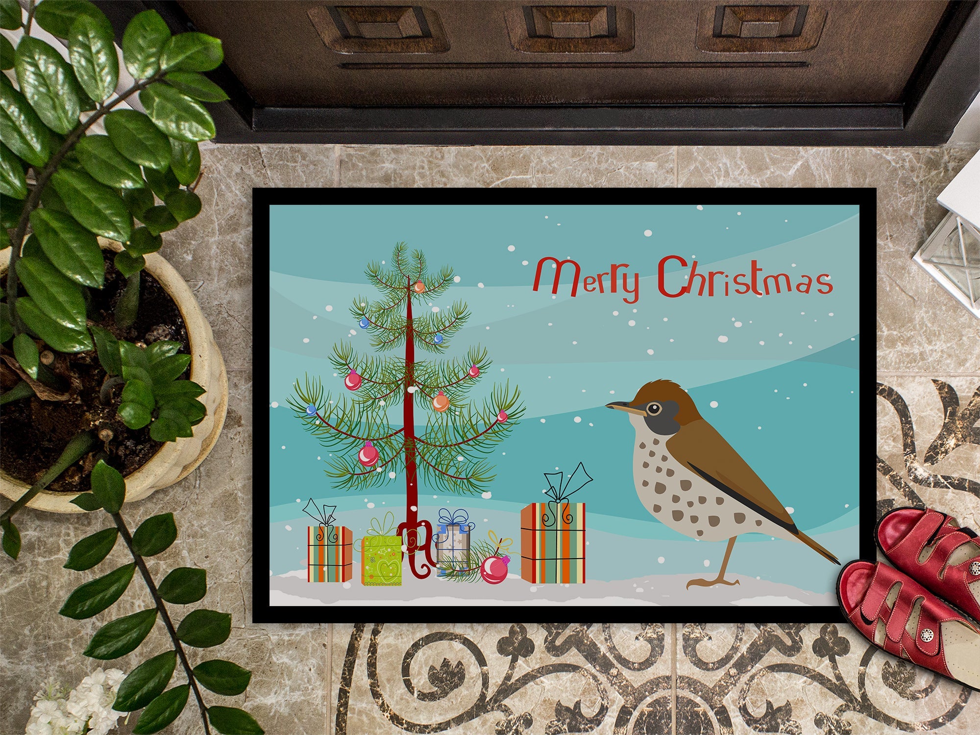 Decorate your space with our Christmas Thrush artwork on a Doormat. Welcome your guests in style with our Artwork Door Mat, designed to withstand almost any weather condition. This mat, measuring approximately 18 by 27 inches, is held together by durable black binding tape. Its top layer, composed of polyester felt, is dyed with the eye-catching image you see on the mat. A few layers below provide the mat with stability, while its rubber bottom is stamped to help prevent slipping and ensures safety. Our mat works wonderfully as both an indoor or outdoor door mat. For cleaning, simply hose it off with water or use a power washer - no need for any cleaner that produces suds. Avoid scrubbing with a brush, instead, opt for the vacuum on floor setting. Designed manufactured and printed in the USA, this mat is a perfect addition to your porch, outdoor kitchen, entryway, or any indoor space. Its unique design makes it a charming decorative rug that greets your guests and adds a stylish touch to your home decor.