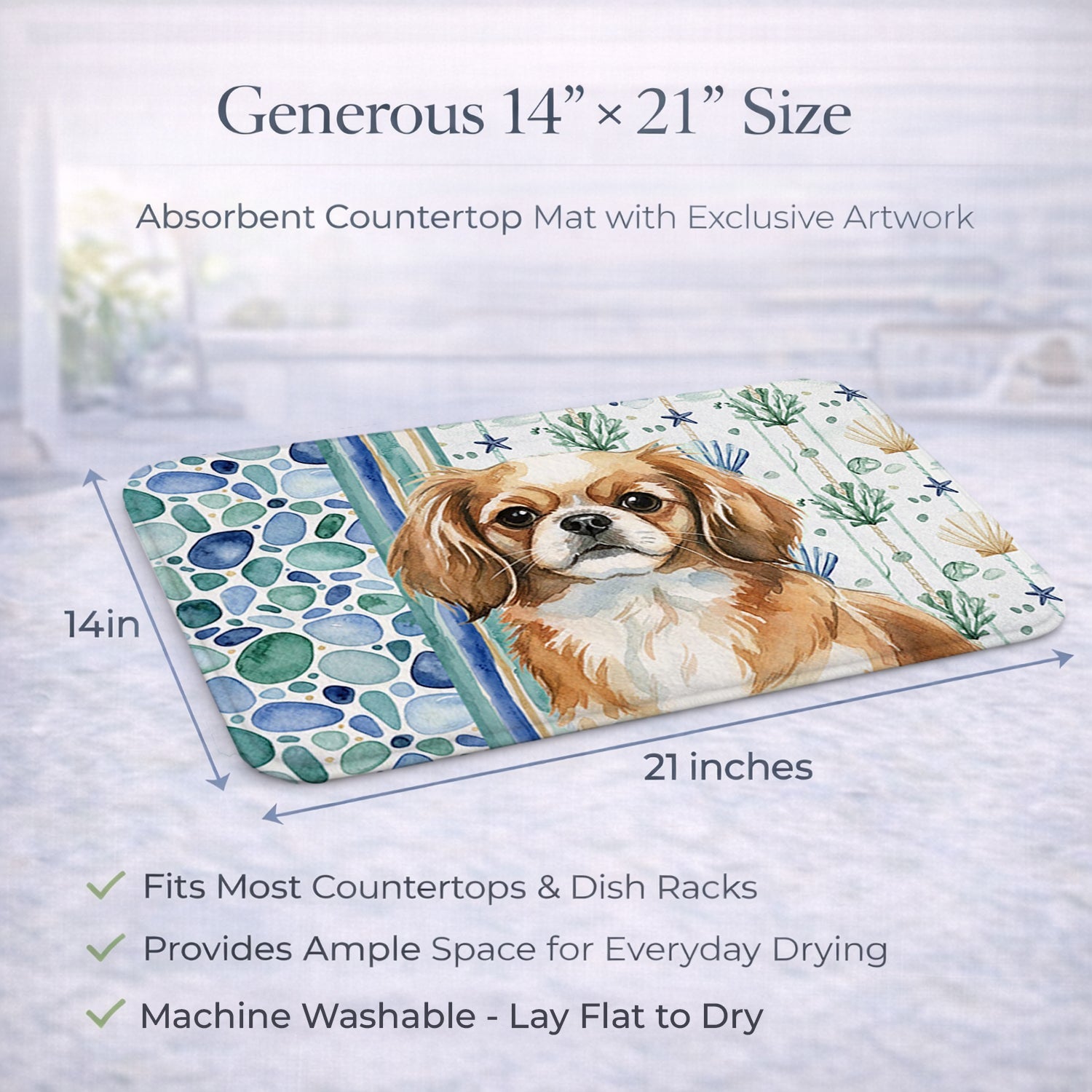 Shown here is the Tibetan Spaniel Coastal Sea Glass Dish Drying Mat from Caroline's Treasures featuring artwork of a Tibetan Spaniel in a Everyday design. The detailed illustration and vibrant colors make it a standout accent that celebrates both seasonal style and love for the subject. This image features a calming coastal watercolor pattern with soft seashells, seaweed, starfish, and pebble-inspired accents arranged in a repeating design. The soothing palette of blues, greens, and sandy neutrals creates a relaxed, beach-inspired look that adds a fresh and tranquil feel to any space. Everyday décor celebrates personal style and the small moments that make a house feel like home. Thoughtful designs add warmth and personality that can be enjoyed year-round. Say goodbye to messy countertops and soggy dish towels with our innovative dish drying mat. Our high-quality dish drying pad is designed to keep your countertops dry while offering a stylish and efficient solution. Whether you're air drying dishes, glasses, stemware, silverware, pots, pans, bottles, or even fruits and vegetables, our dish mat is the perfect choice. The 14 inches x 21 inches size fits most counters and dish drying racks, and the non-slip design ensures stability. Made with water-absorbent polyester and a polyurethane foam insert, our dish drying mat is not only functional but also durable. It's machine washable and printed in the USA for long-lasting use. The beautiful artwork adds flair to your kitchen decor, making it a perfect housewarming gift or present for any occasion. Upgrade your kitchen experience with our absorbent and versatile dish drying mat. Perfect for: Kitchen counters and sinks, everyday dish drying and countertop protection, Dogs-themed homes, or year-round use for Tibetan Spaniel lovers. Tibetan Spaniels are small companion dogs known for their intelligence and alert nature. This breed is cherished for its loyalty, independence, and affectionate personality. Makes a heartfelt gift for: Tibetan Spaniel owners, Dogs lovers, Everyday gifts, pet parents, friends who adore their Tibetan Spaniel, or anyone celebrating Dogs.
