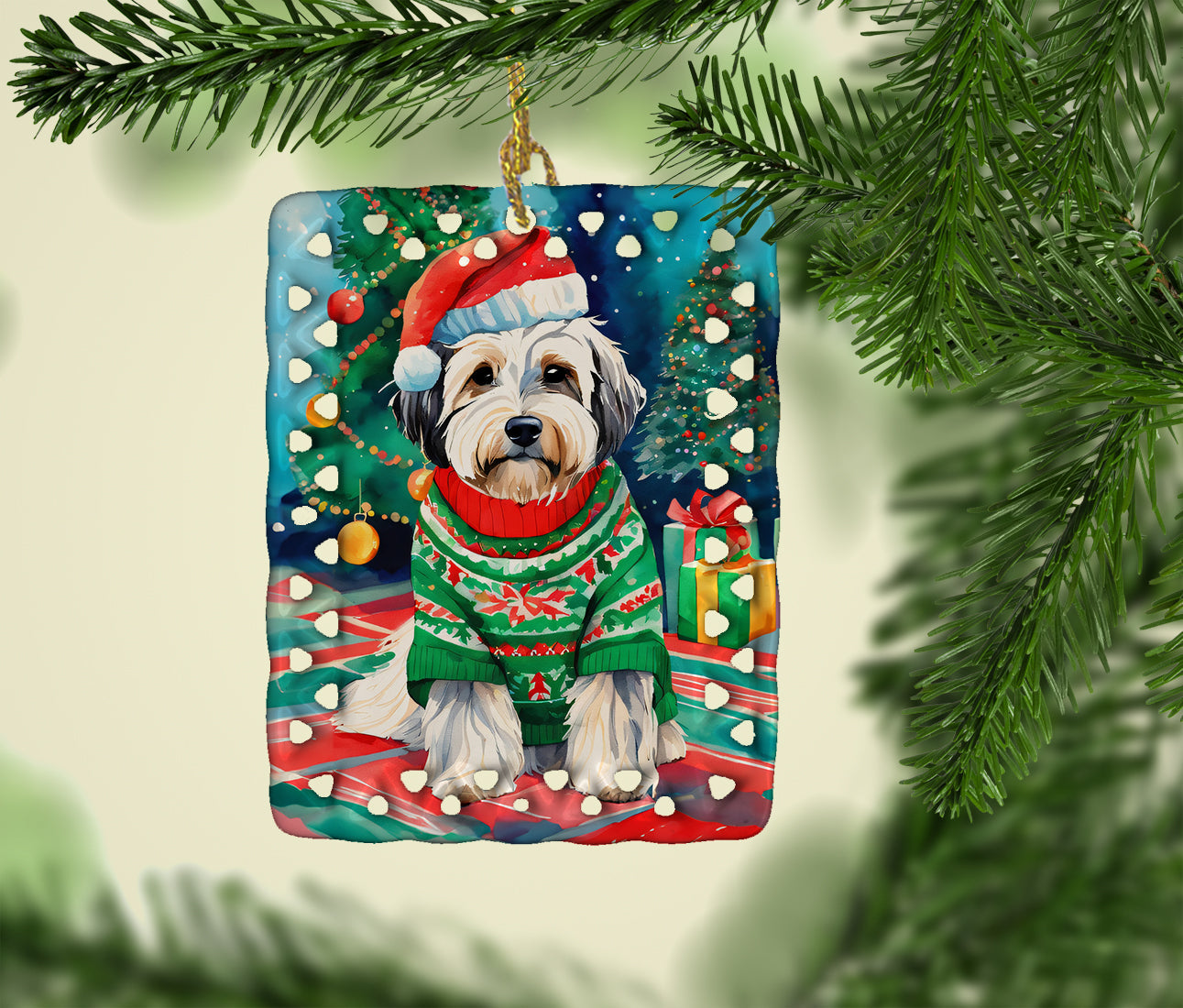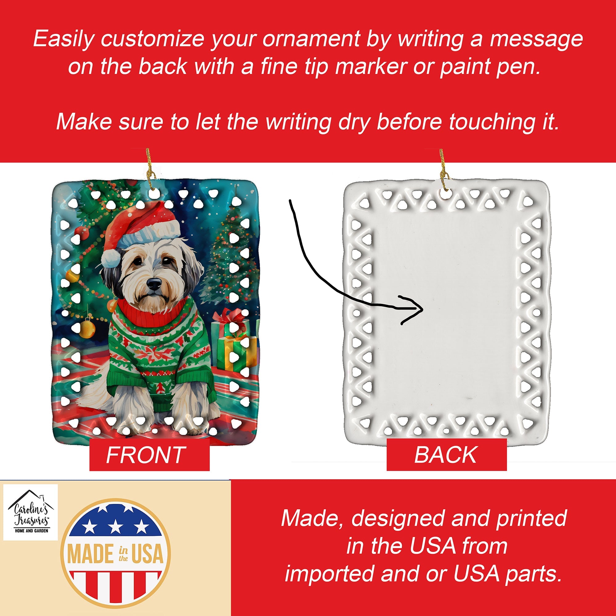 Porcelain Ornament featuring breed specific Tibetan Terrier artwork. Celebrate Christmas with this Christmas Ornament. Add a unique, personal touch to your holiday decor with our Rectangular Lattice Porcelain Ornament. Perfect for creating cherished memories, this high-quality ornament shines under festive lights, reflecting warmth and joy throughout your Christmas tree. Crafted with a glossy finish, it showcases vibrant, full-color artwork contributed by our talented artists, ensuring your tree is adorned with a burst of color and holiday spirit. What sets this Porcelain Ornament apart is its customizable white back. Use a paint pen or permanent marker to write a heartfelt message, commemorate a special year, or mark an unforgettable date, turning this ornament into a keepsake that will be treasured for years to come. For best results, allow any personalization to dry thoroughly before handling. Each ornament comes complete with a delicate gold cord, making it easy to hang and display. Proudly made in the USA, this ornament measures 3.375 x 2.625 inches and is a thoughtful gift for pet sitters, teachers, family members, or anyone who would appreciate a little extra holiday magic. Bring style, charm, and a touch of personal meaning to your Christmas tree with this beautifully designed ornament..