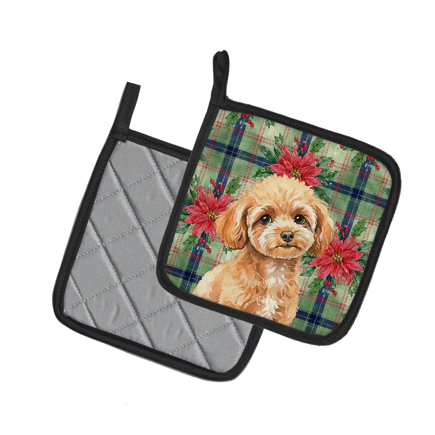 Pair of Pot Holders featuring breed specific Poodle artwork. Celebrate Christmas with this Christmas Pair of Pot Holders. Add warmth, personality, and function to your kitchen with our Christmas Poinsettas Pot Holder Pair. Each set includes two quilted hot pads, featuring original full-color watercolor artwork on a soft polyester front accented by black trim. Crafted with multiple layers for performance: Top Layer: Vibrant artwork permanently dyed into polyester fabric. Middle Layer: US-manufactured insulated material with breathable polyester fibers and a reflective metalized film that reflects heat back to its source. Bottom Layer: A silver heat-resistant backing for extra protection. Each pot holder measures 7.5" x 7.5", includes a hanging tab, and is quilted for durability. Use them to protect your hands, countertops, and tabletops — or as decorative trivets for Thanksgiving, Christmas, or everyday meals.