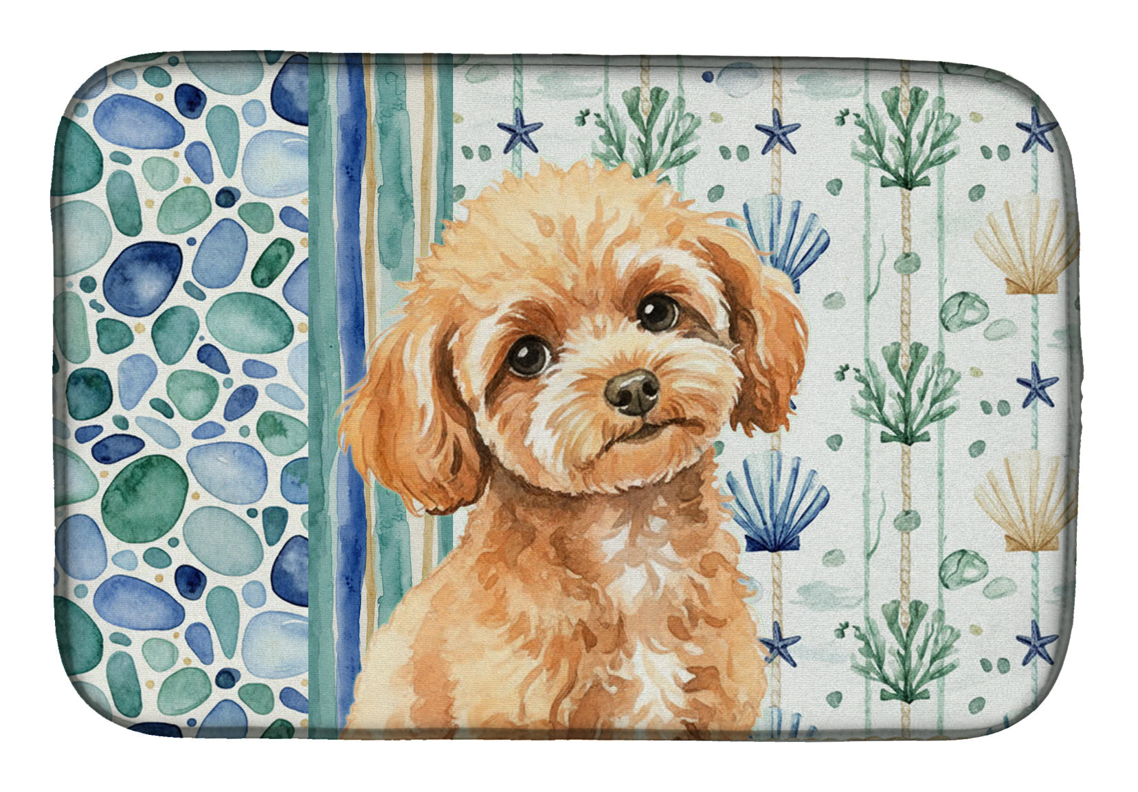 Shown here is the Toy Apricot Poodle Coastal Sea Glass Dish Drying Mat from Caroline's Treasures featuring artwork of a Poodle in a Everyday design. The detailed illustration and vibrant colors make it a standout accent that celebrates both seasonal style and love for the subject. This image features a calming coastal watercolor pattern with soft seashells, seaweed, starfish, and pebble-inspired accents arranged in a repeating design. The soothing palette of blues, greens, and sandy neutrals creates a relaxed, beach-inspired look that adds a fresh and tranquil feel to any space. Everyday décor celebrates personal style and the small moments that make a house feel like home. Thoughtful designs add warmth and personality that can be enjoyed year-round. Say goodbye to messy countertops and soggy dish towels with our innovative dish drying mat. Our high-quality dish drying pad is designed to keep your countertops dry while offering a stylish and efficient solution. Whether you're air drying dishes, glasses, stemware, silverware, pots, pans, bottles, or even fruits and vegetables, our dish mat is the perfect choice. The 14 inches x 21 inches size fits most counters and dish drying racks, and the non-slip design ensures stability. Made with water-absorbent polyester and a polyurethane foam insert, our dish drying mat is not only functional but also durable. It's machine washable and printed in the USA for long-lasting use. The beautiful artwork adds flair to your kitchen decor, making it a perfect housewarming gift or present for any occasion. Upgrade your kitchen experience with our absorbent and versatile dish drying mat. Perfect for: Kitchen counters and sinks, everyday dish drying and countertop protection, Dogs-themed homes, or year-round use for Poodle lovers. Poodles are highly intelligent dogs known for their elegance and versatility. Available in standard, miniature, and toy sizes, this breed is admired for its trainability and loyalty. Makes a heartfelt gift for: Poodle owners, Dogs lovers, Everyday gifts, pet parents, friends who adore their Poodle, or anyone celebrating Dogs.