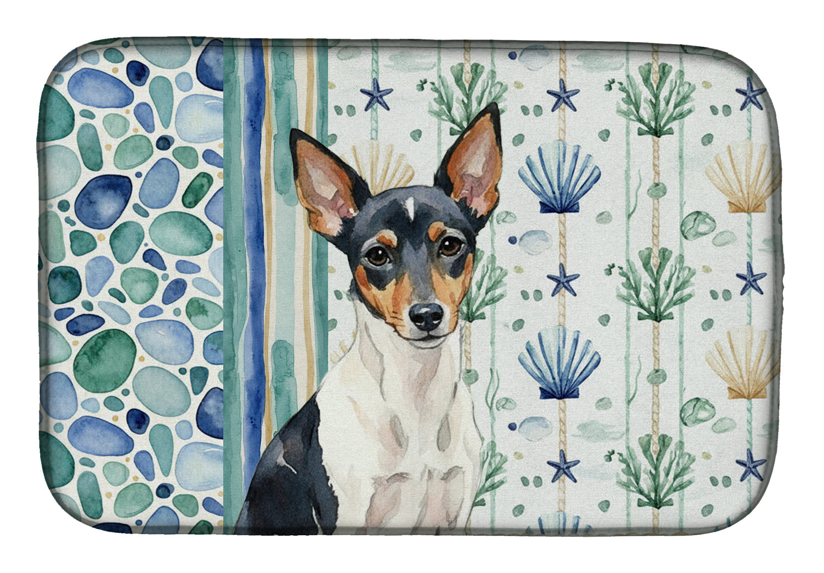 Shown here is the Toy Fox Terrier Coastal Sea Glass Dish Drying Mat from Caroline's Treasures featuring artwork of a Toy Fox Terrier in a Everyday design. The detailed illustration and vibrant colors make it a standout accent that celebrates both seasonal style and love for the subject. This image features a calming coastal watercolor pattern with soft seashells, seaweed, starfish, and pebble-inspired accents arranged in a repeating design. The soothing palette of blues, greens, and sandy neutrals creates a relaxed, beach-inspired look that adds a fresh and tranquil feel to any space. Everyday décor celebrates personal style and the small moments that make a house feel like home. Thoughtful designs add warmth and personality that can be enjoyed year-round. Say goodbye to messy countertops and soggy dish towels with our innovative dish drying mat. Our high-quality dish drying pad is designed to keep your countertops dry while offering a stylish and efficient solution. Whether you're air drying dishes, glasses, stemware, silverware, pots, pans, bottles, or even fruits and vegetables, our dish mat is the perfect choice. The 14 inches x 21 inches size fits most counters and dish drying racks, and the non-slip design ensures stability. Made with water-absorbent polyester and a polyurethane foam insert, our dish drying mat is not only functional but also durable. It's machine washable and printed in the USA for long-lasting use. The beautiful artwork adds flair to your kitchen decor, making it a perfect housewarming gift or present for any occasion. Upgrade your kitchen experience with our absorbent and versatile dish drying mat. Perfect for: Kitchen counters and sinks, everyday dish drying and countertop protection, Dogs-themed homes, or year-round use for Toy Fox Terrier lovers. Toy Fox Terriers are small dogs with smooth coats and alert expressions. Their appearance feels lively and confident. Makes a heartfelt gift for: Toy Fox Terrier owners, Dogs lovers, Everyday gifts, pet parents, friends who adore their Toy Fox Terrier, or anyone celebrating Dogs.