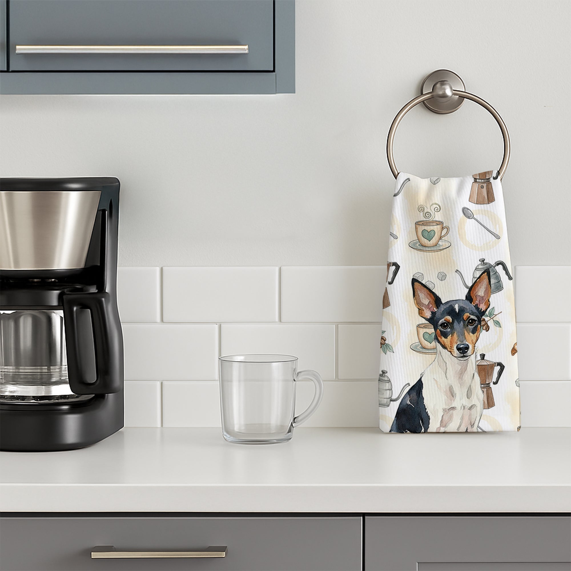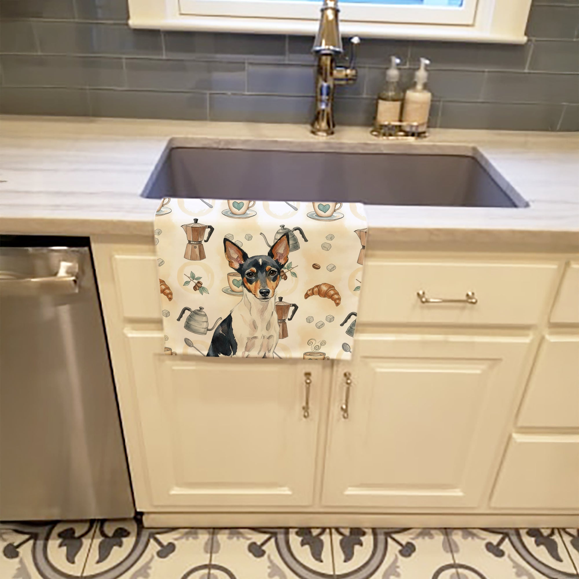 Kitchen Towel featuring breed specific Toy Fox Terrier artwork. Start your morning with charm and function thanks to our Coffee Time Kitchen Towel Collection. Featuring playful watercolor artwork of coffee pots, cups, croissants, and a dog portrait, these towels bring warmth and personality to your kitchen or bath. Crafted with a plush minky polyester front that polishes glassware to a shine, and a 100% cotton terry loop back for absorbency, they combine durability with practicality. Artwork is permanently dyed into the fibers to keep colors fresh wash after wash. Measuring 15" x 25", these machine-washable towels are finished with bound edges to hold their shape. Designed and printed in the USA, they’re perfect for kitchens, coffee bars, guest baths, or as thoughtful gifts for dog lovers and coffee enthusiasts alike.