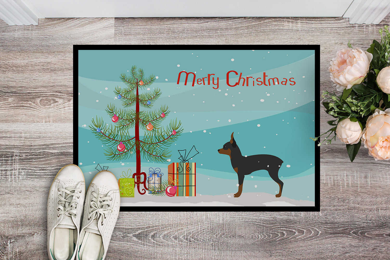 Decorate your space with our Christmas Fox Terrier artwork on a Doormat. Welcome your guests in style with our Artwork Door Mat, designed to withstand almost any weather condition. This mat, measuring approximately 18 by 27 inches, is held together by durable black binding tape. Its top layer, composed of polyester felt, is dyed with the eye-catching image you see on the mat. A few layers below provide the mat with stability, while its rubber bottom is stamped to help prevent slipping and ensures safety. Our mat works wonderfully as both an indoor or outdoor door mat. For cleaning, simply hose it off with water or use a power washer - no need for any cleaner that produces suds. Avoid scrubbing with a brush, instead, opt for the vacuum on floor setting. Designed manufactured and printed in the USA, this mat is a perfect addition to your porch, outdoor kitchen, entryway, or any indoor space. Its unique design makes it a charming decorative rug that greets your guests and adds a stylish touch to your home decor.
