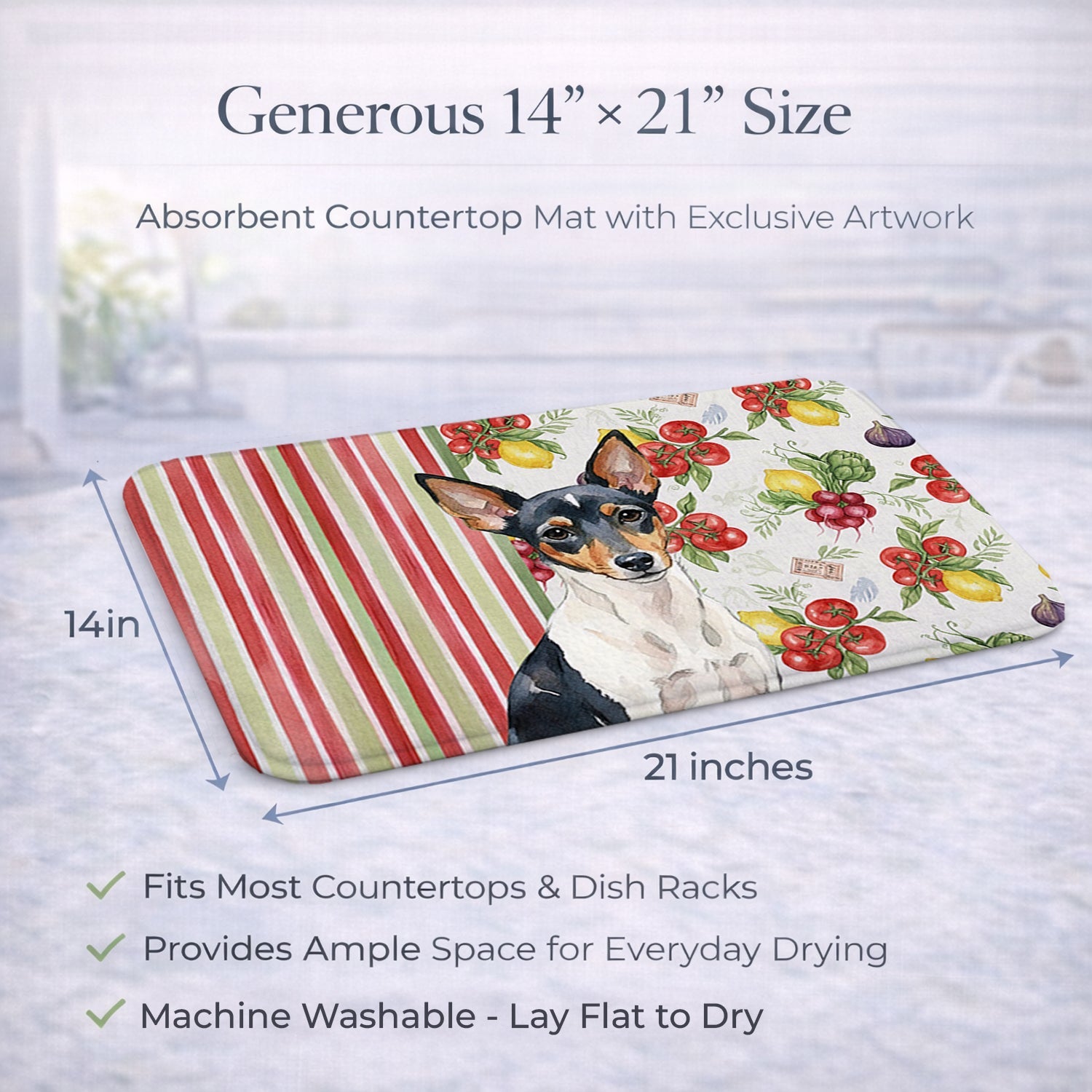 Shown here is the Toy Fox Terrier Vegetables Dish Drying Mat from Caroline's Treasures featuring artwork of a Toy Fox Terrier in a Everyday design. The detailed illustration and vibrant colors make it a standout accent that celebrates both seasonal style and love for the subject. This image features a vibrant watercolor vegetable pattern with tomatoes, lemons, artichokes, figs, radishes, and leafy greens arranged in a repeating design, paired with classic red and green stripes. The bright, garden-fresh palette creates a cheerful, farmhouse-inspired look that feels lively, welcoming, and perfect for kitchen décor. Everyday décor celebrates personal style and the small moments that make a house feel like home. Thoughtful designs add warmth and personality that can be enjoyed year-round. Say goodbye to messy countertops and soggy dish towels with our innovative dish drying mat. Our high-quality dish drying pad is designed to keep your countertops dry while offering a stylish and efficient solution. Whether you're air drying dishes, glasses, stemware, silverware, pots, pans, bottles, or even fruits and vegetables, our dish mat is the perfect choice. The 14 inches x 21 inches size fits most counters and dish drying racks, and the non-slip design ensures stability. Made with water-absorbent polyester and a polyurethane foam insert, our dish drying mat is not only functional but also durable. It's machine washable and printed in the USA for long-lasting use. The beautiful artwork adds flair to your kitchen decor, making it a perfect housewarming gift or present for any occasion. Upgrade your kitchen experience with our absorbent and versatile dish drying mat. Perfect for: Kitchen counters and sinks, everyday dish drying and countertop protection, Dogs-themed homes, or year-round use for Toy Fox Terrier lovers. Toy Fox Terriers are small dogs with smooth coats and alert expressions. Their appearance feels lively and confident. Makes a heartfelt gift for: Toy Fox Terrier owners, Dogs lovers, Everyday gifts, pet parents, friends who adore their Toy Fox Terrier, or anyone celebrating Dogs.