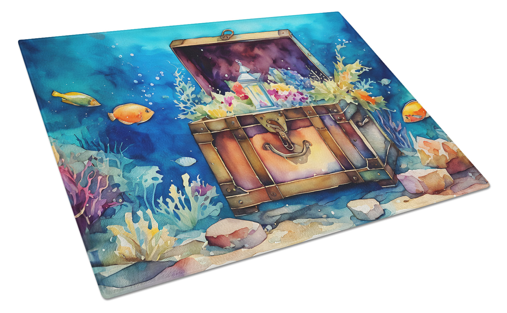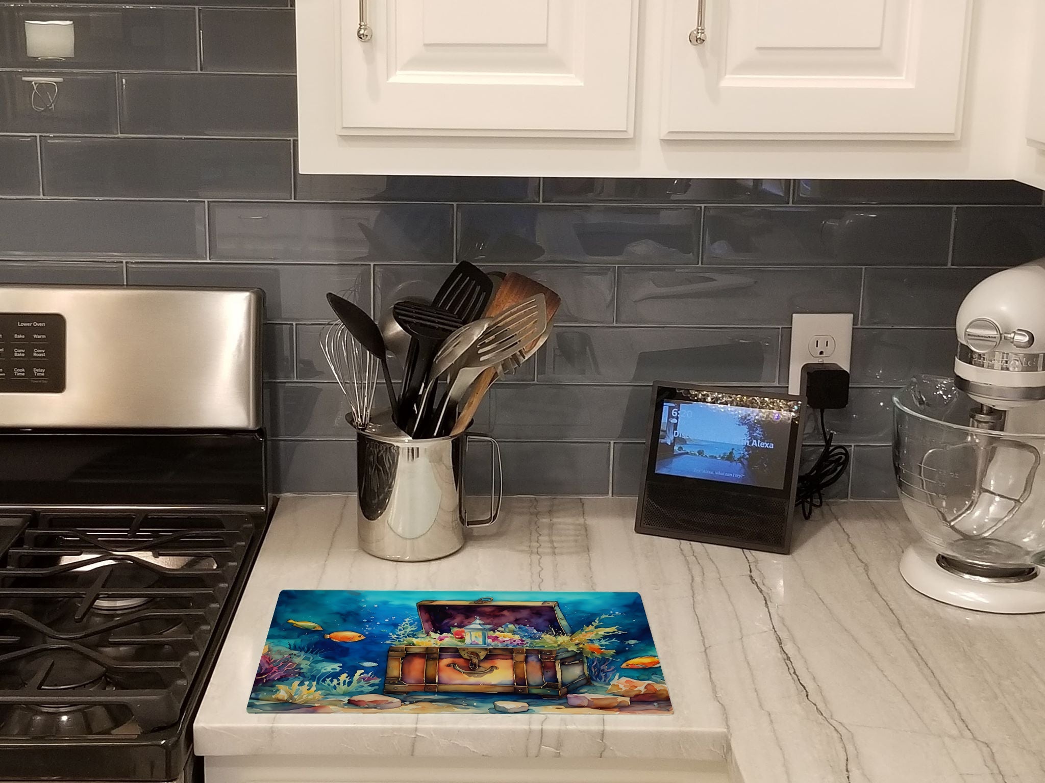Decorate your space with our Treasure Chest artwork on a Cutting Board. Introduce your kitchen to the vibrant, large Decorative Glass Cutting Board from Caroline's Treasures. Crafted from resilient tempered glass, this board is not only a utilitarian necessity but also a colorful art piece. With its generous dimensions of 15 inches in height and 12 inches in length, it offers ample space for all your cutting needs. Every piece showcases captivating artwork from distinguished artists, bringing an aesthetic edge to your kitchen. Beyond its attractive design, this cutting board ensures your countertop stays pristine and unscathed, owing to its heat-resistant properties. Engineered with user convenience in mind, it features non-skid feet for stability, and rounded corners for additional safety. Its robust construction renders it virtually unbreakable, guaranteeing longevity. The board comes with protective feet bumpers, maintaining its position during use. This product is recommended to be hand washed only. Proudly printed and assembled in the United States, this cutting board exemplifies superior craftsmanship. With Caroline's Treasures' Decorative Glass Cutting Board, you're investing in a blend of functionality and artistic flair.