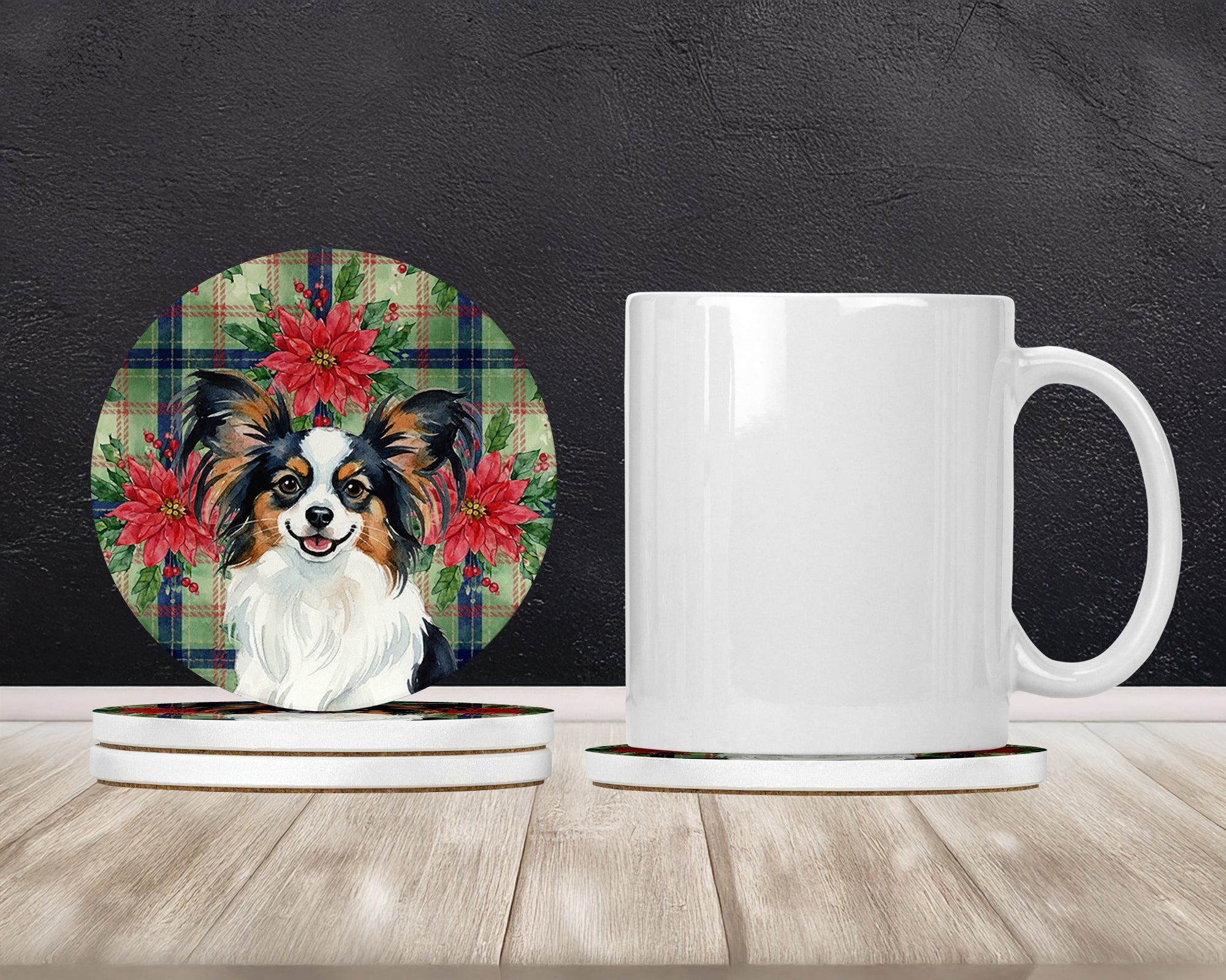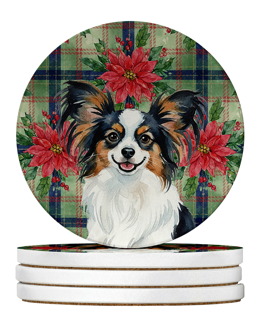 Large Sandstone Coasters Pack of 4 featuring breed specific Papillon artwork. Celebrate Christmas with this Christmas Sandstone Coasters Pack of 4. Introducing Caroline's Treasures Large Sandstone Coasters Pack of 4, the perfect addition to your home decor. Each coaster measures nearly 4 inches and is made from absorbent sandstone with a cork backing. Designed and printed in the United States, these coasters feature artwork from Caroline's Treasures' talented artists. Protect your countertops and tables from hot and cold drink condensation with these absorbent coasters. They efficiently absorb moisture, ensuring your surfaces stay dry and clean. Choose from a wide range of designs to update and enhance your decor or give them as a thoughtful gift for any occasion. Cleaning is a breeze�simply wipe the coaster with a damp towel to remove any spills or stains. Each set comes in a brown gift box, making it ready to be wrapped for that special person in your life. These absorbent sandstone coasters also make an excellent housewarming gift, providing both practicality and style. Celebrate birthdays, Mother's Day, Father's Day, Thanksgiving, Christmas, Teacher's Appreciation Day, or simply show someone you care with these versatile and charming coasters. Caroline's Treasures Large Sandstone Coasters Pack of 4 is the perfect happy gift for any occasion.