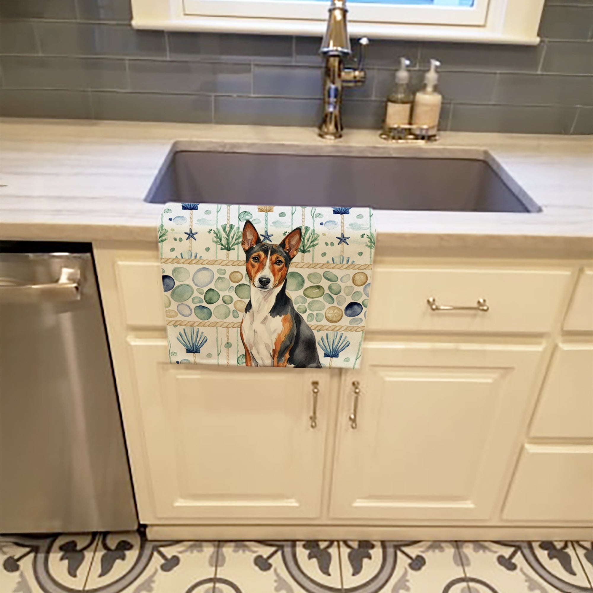 Kitchen Towel featuring breed specific Basenji artwork. Bring breezy coastal charm to your kitchen or bath with our plush velour towel featuring original watercolor artwork. The soft minky polyester front showcases vivid seashell and starfish designs with a dog portrait, perfect for polishing glassware to a brilliant shine. The 100% cotton terry loop back delivers superior absorbency for drying hands, dishes, or counters. Artwork is dyed directly into the fibers for lasting color that won’t crack or peel. Each towel measures 15" x 25", with bound edges to maintain shape after repeated washes. Machine washable and tumble dry low for easy care. Designed and printed in the USA, these towels combine function and style—ideal for beach homes, coastal kitchens, or as thoughtful gifts.