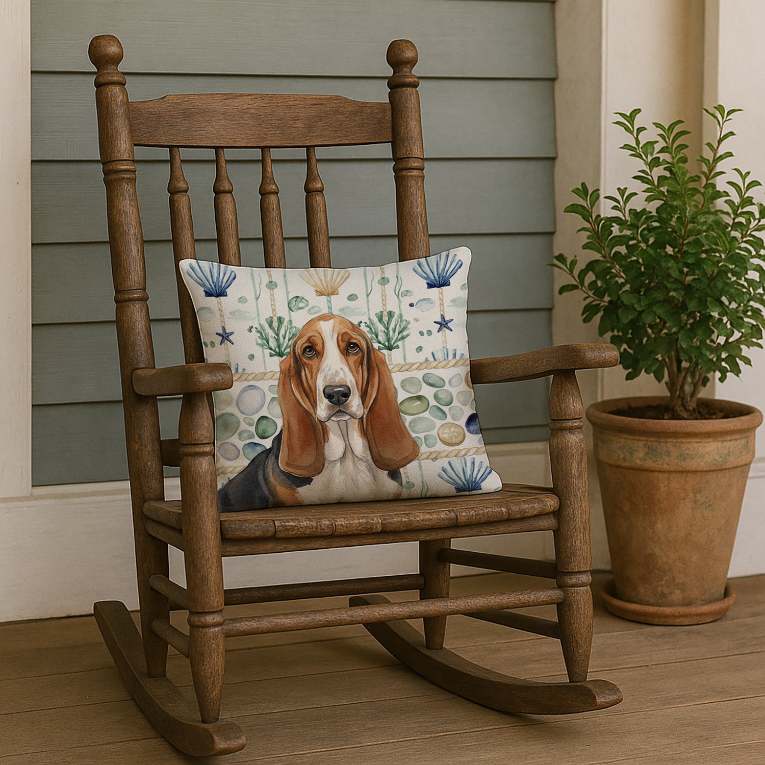 Throw Pillow featuring breed specific Basset Hound artwork. Revitalize your outdoor or indoor living space with Caroline's Treasures 18x18 Fabric Decorative Pillow. With a generously sized dimension of approximately 18 inches by 18 inches, this pillow makes a comfortable and aesthetic addition to any seating area. Made from a unique, water-resistant material developed by Caroline's Treasures, the pillow sham is 100% polyester fabric that's durable and ready to weather any condition. Its vibrant, full-color artwork will not fade over time as it is dyed with color-fast dyes. Whether you place it on your patio furniture, porch, veranda, or indoor couch, its soft canvas fabric ensures a cozy experience. The pillow is handcrafted in the United States, featuring a sham created from three pieces of fabric and a polyester insert for enduring shape and overstuffed comfort. Despite being robustly built to endure the outdoors, it is as soft and snug as your favorite indoor cushions. Please note, as all our pillows are handmade, sizes may vary slightly, adding to the charm of this unique decorative item.