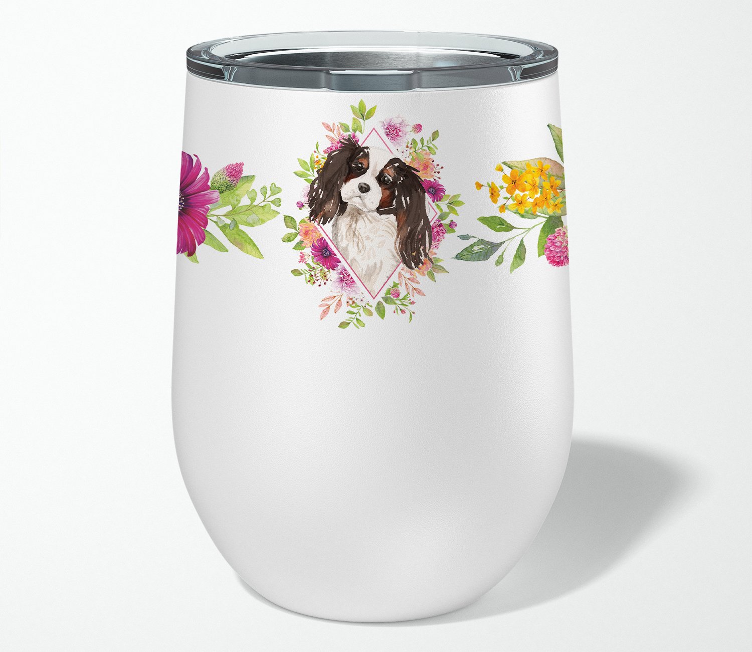 Decorate your space with our Cavalier King Charles Spaniel artwork on a 12 oz Stainless Stemless Wine Glass. Enjoy your favorite beverage in style and comfort with our beautifully crafted 12-ounce Double Wall Vacuum Insulated Stainless Steel Stemless Wine Glass. This stylish tumbler, with its sleek and modern design, caters to both men and women who appreciate quality and elegance in their drinkware. This stemless wine glass boasts a double-walled vacuum insulated design to keep your wine at the perfect temperature for longer, providing you with an exceptional drinking experience. The tumbler's stainless steel construction ensures durability, while its easy-to-grasp shape offers a comfortable hold for prolonged enjoyment. With safety and health as our top priority, our wine glass is 100% free from BPA and Phthalates. It features a secure lid with an easy opening for hassle-free sipping. The vibrant color artwork adds a personalized touch, enhancing your overall drinking experience. Although sturdy, we recommend hand washing this product to maintain its unique qualities. Embrace sustainability by replacing disposable plastic bottles with our reusable Tumblers. A simple choice that can significantly reduce environmental pollution. Perfectly packed in a gift box, our tumbler is an excellent gift choice for your loved ones. Elevate your wine-drinking experience and make a positive impact on the environment with our remarkable tumbler._x000B_