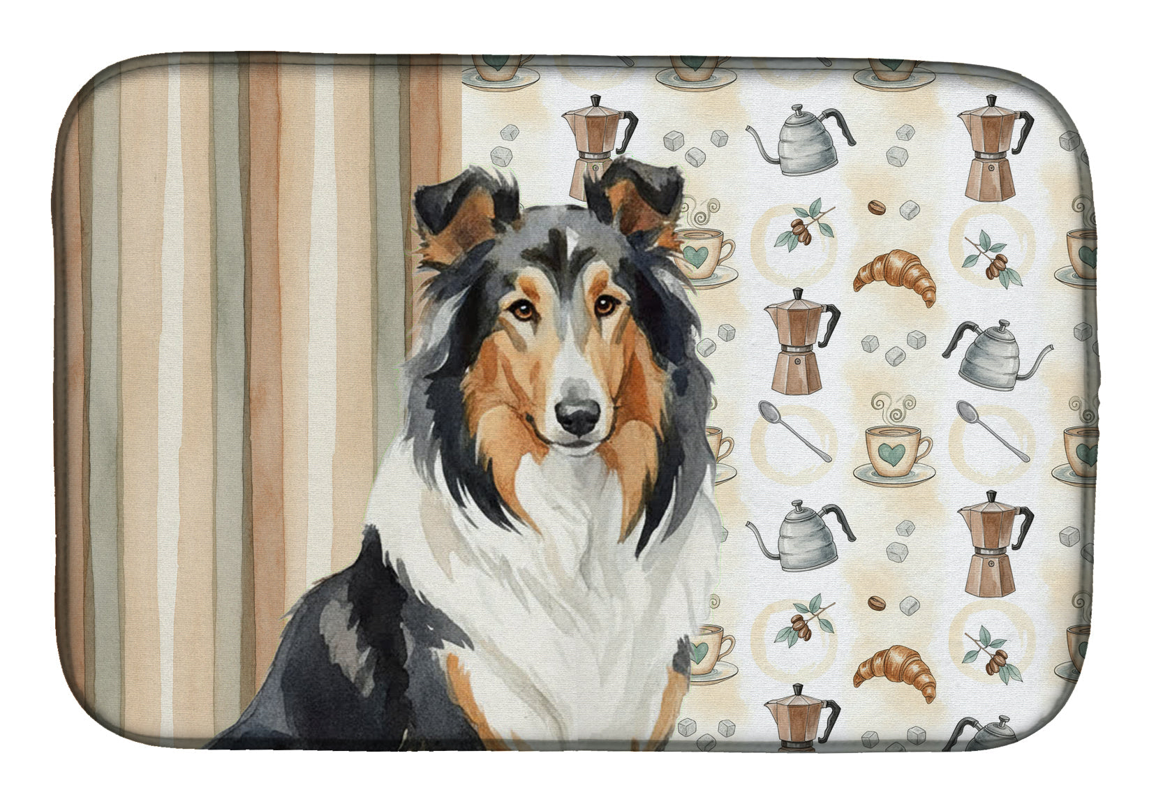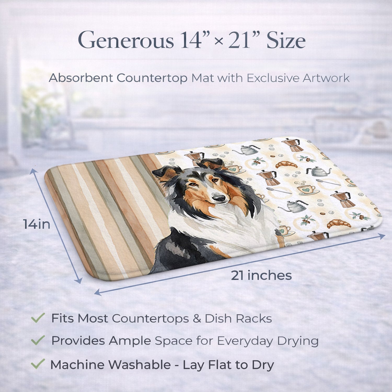 Shown here is the Tricolor Collie Coffee Bar Dish Drying Mat from Caroline's Treasures featuring artwork of a Collie in a Everyday design. The detailed illustration and vibrant colors make it a standout accent that celebrates both seasonal style and love for the subject. This image features a cozy watercolor coffee-themed pattern with illustrated mugs, moka pots, kettles, croissants, coffee beans, and sugar cubes arranged in a repeating design. Soft neutral tones with warm browns, creams, and subtle sage accents create an inviting, café-inspired look that feels comforting and relaxed. Everyday décor celebrates personal style and the small moments that make a house feel like home. Thoughtful designs add warmth and personality that can be enjoyed year-round. Say goodbye to messy countertops and soggy dish towels with our innovative dish drying mat. Our high-quality dish drying pad is designed to keep your countertops dry while offering a stylish and efficient solution. Whether you're air drying dishes, glasses, stemware, silverware, pots, pans, bottles, or even fruits and vegetables, our dish mat is the perfect choice. The 14 inches x 21 inches size fits most counters and dish drying racks, and the non-slip design ensures stability. Made with water-absorbent polyester and a polyurethane foam insert, our dish drying mat is not only functional but also durable. It's machine washable and printed in the USA for long-lasting use. The beautiful artwork adds flair to your kitchen decor, making it a perfect housewarming gift or present for any occasion. Upgrade your kitchen experience with our absorbent and versatile dish drying mat. Perfect for: Kitchen counters and sinks, everyday dish drying and countertop protection, Dogs-themed homes, or year-round use for Collie lovers. Collies are intelligent herding dogs known for their loyalty and gentle nature. This iconic breed is cherished for its devotion to family and strong protective instincts. Makes a heartfelt gift for: Collie owners, Dogs lovers, Everyday gifts, pet parents, friends who adore their Collie, or anyone celebrating Dogs.