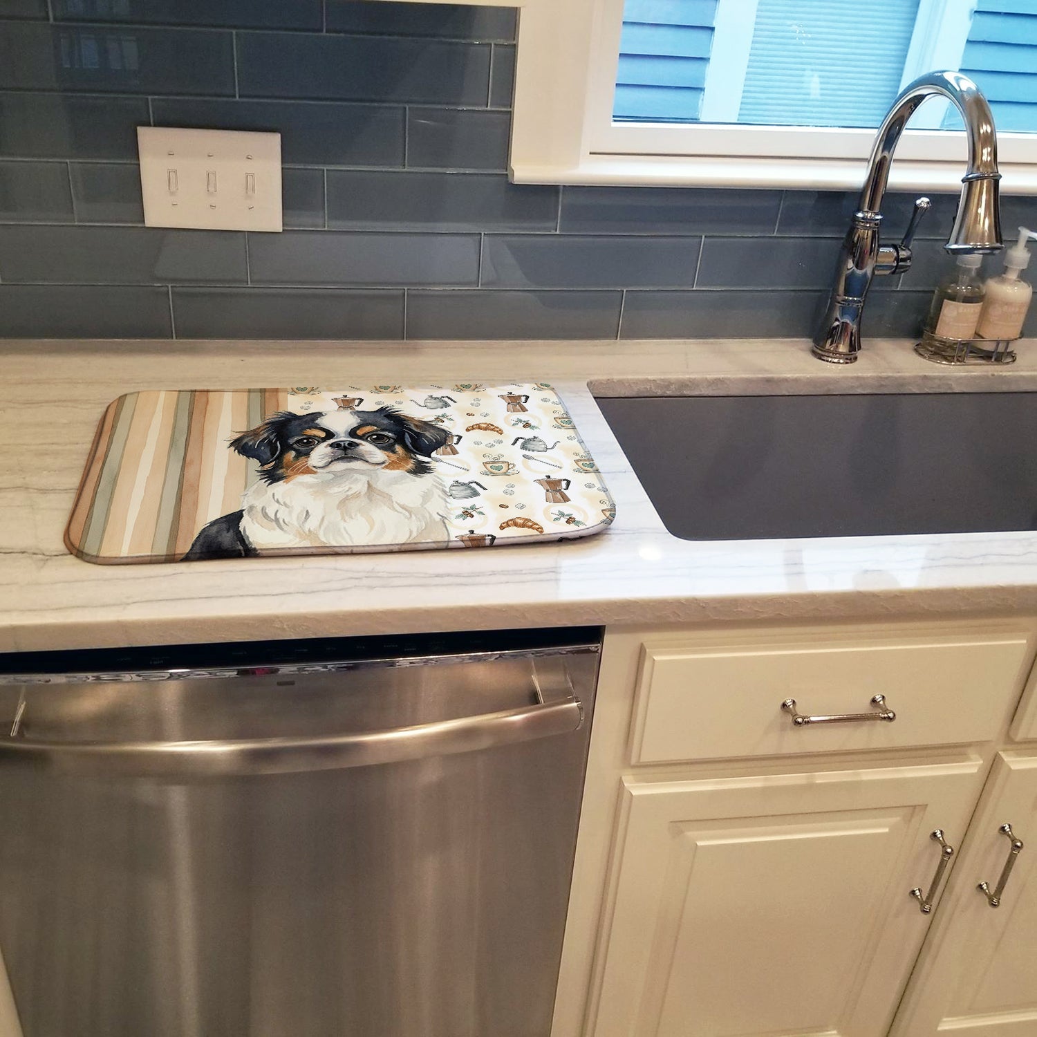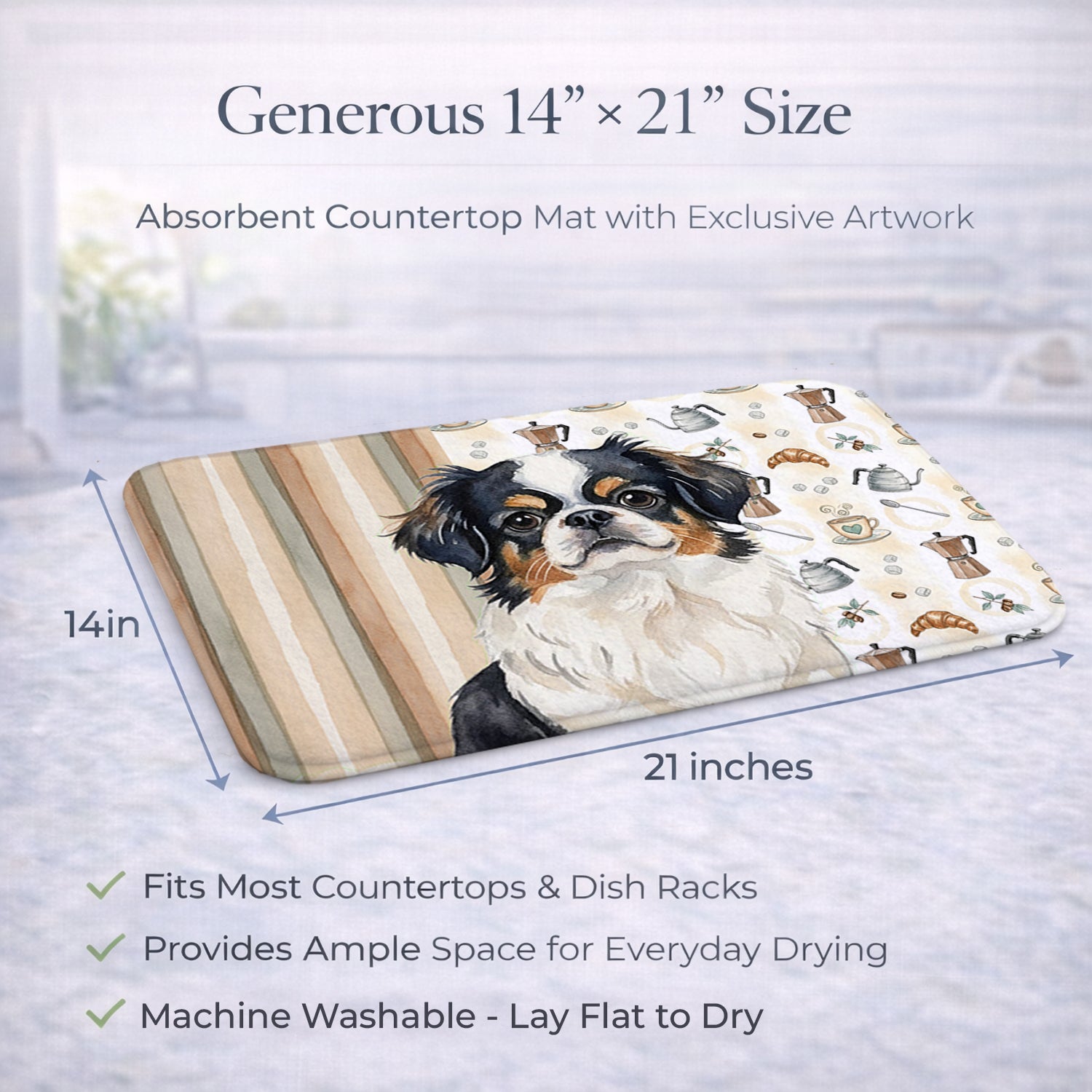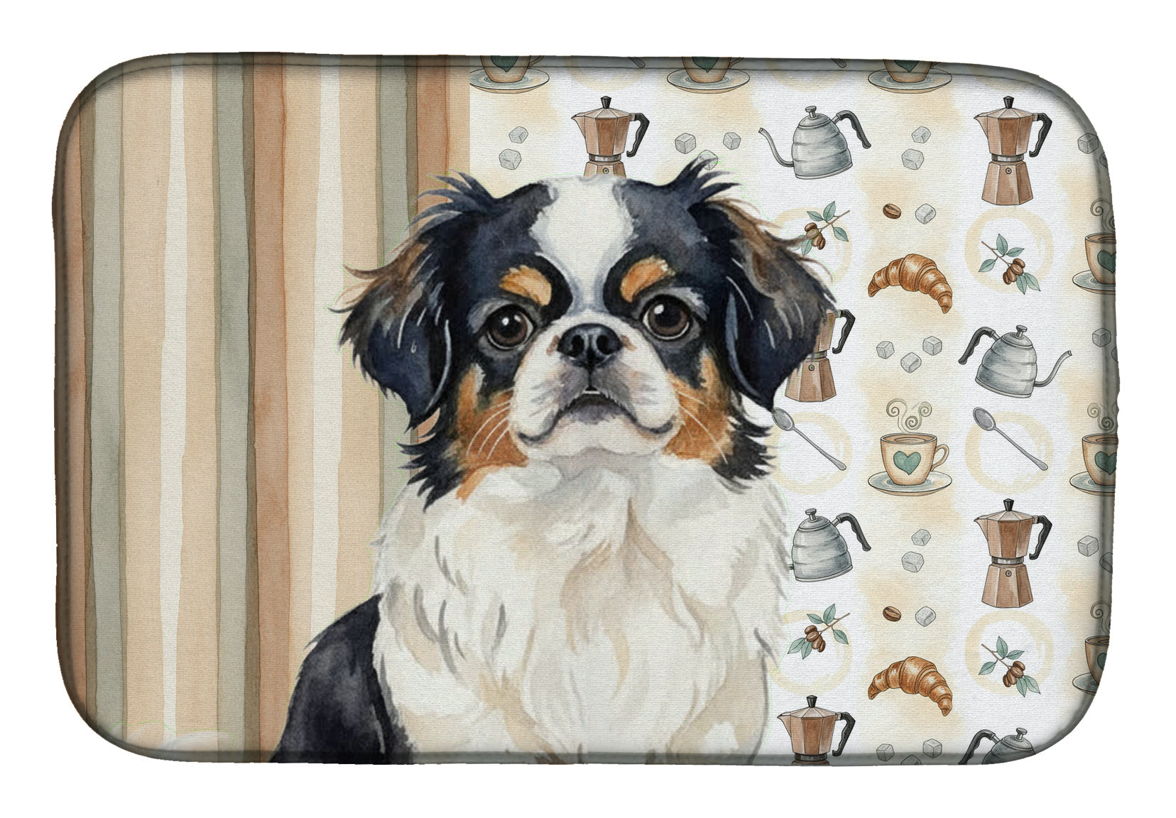 Shown here is the Tricolor Japanese Chin Coffee Bar Dish Drying Mat from Caroline's Treasures featuring artwork of a Japanese Chin in a Everyday design. The detailed illustration and vibrant colors make it a standout accent that celebrates both seasonal style and love for the subject. This image features a cozy watercolor coffee-themed pattern with illustrated mugs, moka pots, kettles, croissants, coffee beans, and sugar cubes arranged in a repeating design. Soft neutral tones with warm browns, creams, and subtle sage accents create an inviting, café-inspired look that feels comforting and relaxed. Everyday décor celebrates personal style and the small moments that make a house feel like home. Thoughtful designs add warmth and personality that can be enjoyed year-round. Say goodbye to messy countertops and soggy dish towels with our innovative dish drying mat. Our high-quality dish drying pad is designed to keep your countertops dry while offering a stylish and efficient solution. Whether you're air drying dishes, glasses, stemware, silverware, pots, pans, bottles, or even fruits and vegetables, our dish mat is the perfect choice. The 14 inches x 21 inches size fits most counters and dish drying racks, and the non-slip design ensures stability. Made with water-absorbent polyester and a polyurethane foam insert, our dish drying mat is not only functional but also durable. It's machine washable and printed in the USA for long-lasting use. The beautiful artwork adds flair to your kitchen decor, making it a perfect housewarming gift or present for any occasion. Upgrade your kitchen experience with our absorbent and versatile dish drying mat. Perfect for: Kitchen counters and sinks, everyday dish drying and countertop protection, Dogs-themed homes, or year-round use for Japanese Chin lovers. Japanese Chins are elegant companion dogs known for their gentle temperament and expressive faces. This breed is cherished for its affectionate nature and close bond with its owners. Makes a heartfelt gift for: Japanese Chin owners, Dogs lovers, Everyday gifts, pet parents, friends who adore their Japanese Chin, or anyone celebrating Dogs.