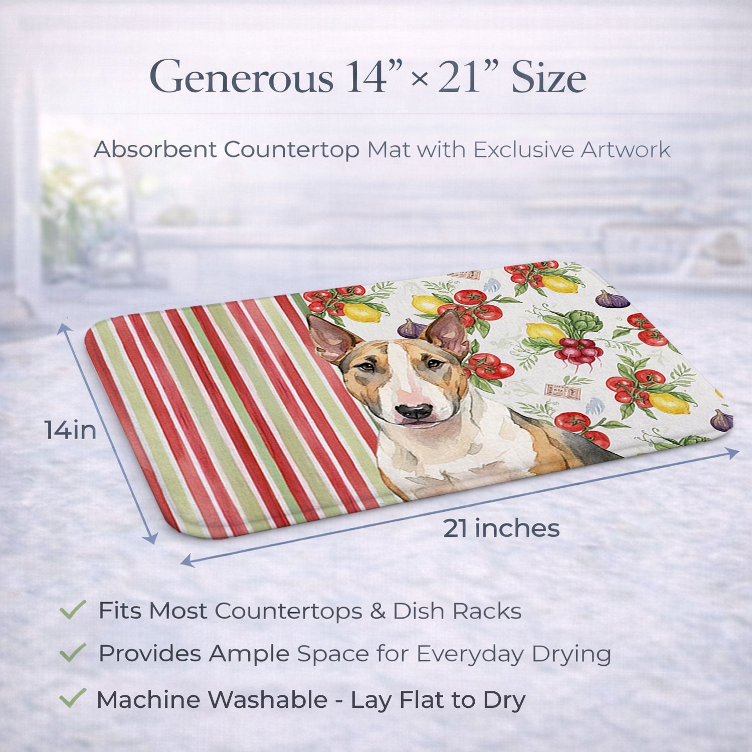 Shown here is the Tricolor Miniature Bull Terrier Vegetables Dish Drying Mat from Caroline's Treasures featuring artwork of a Miniature Bull Terrier in a Everyday design. The detailed illustration and vibrant colors make it a standout accent that celebrates both seasonal style and love for the subject. This image features a vibrant watercolor vegetable pattern with tomatoes, lemons, artichokes, figs, radishes, and leafy greens arranged in a repeating design, paired with classic red and green stripes. The bright, garden-fresh palette creates a cheerful, farmhouse-inspired look that feels lively, welcoming, and perfect for kitchen décor. Everyday décor celebrates personal style and the small moments that make a house feel like home. Thoughtful designs add warmth and personality that can be enjoyed year-round. Say goodbye to messy countertops and soggy dish towels with our innovative dish drying mat. Our high-quality dish drying pad is designed to keep your countertops dry while offering a stylish and efficient solution. Whether you're air drying dishes, glasses, stemware, silverware, pots, pans, bottles, or even fruits and vegetables, our dish mat is the perfect choice. The 14 inches x 21 inches size fits most counters and dish drying racks, and the non-slip design ensures stability. Made with water-absorbent polyester and a polyurethane foam insert, our dish drying mat is not only functional but also durable. It's machine washable and printed in the USA for long-lasting use. The beautiful artwork adds flair to your kitchen decor, making it a perfect housewarming gift or present for any occasion. Upgrade your kitchen experience with our absorbent and versatile dish drying mat. Perfect for: Kitchen counters and sinks, everyday dish drying and countertop protection, Dogs-themed homes, or year-round use for Miniature Bull Terrier lovers. Miniature Bull Terriers feature muscular builds and distinctive head shapes. Their appearance feels bold and confident. Makes a heartfelt gift for: Miniature Bull Terrier owners, Dogs lovers, Everyday gifts, pet parents, friends who adore their Miniature Bull Terrier, or anyone celebrating Dogs.