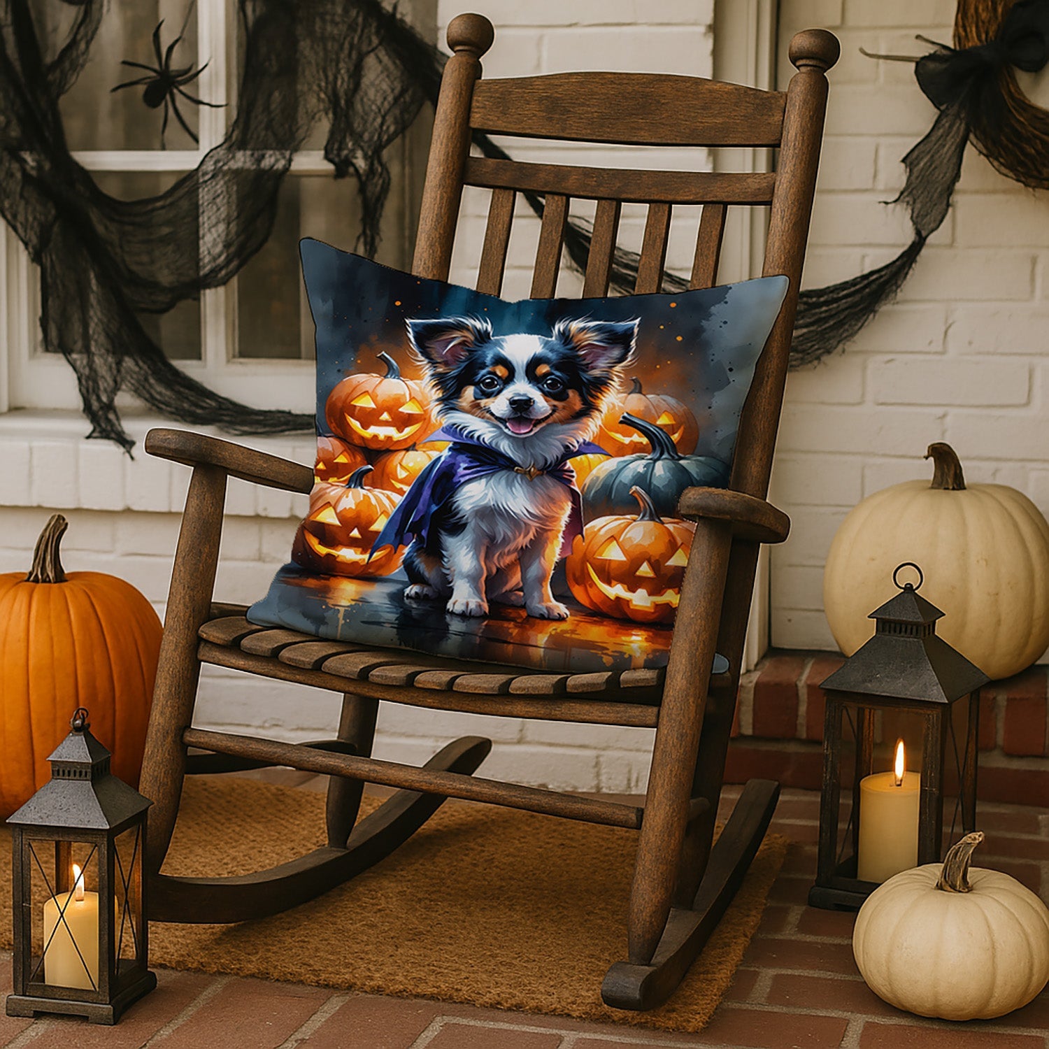 Throw Pillow featuring breed specific Papillon artwork. Celebrate Halloween with this Halloween Pillow. Revitalize your outdoor or indoor living space with Caroline's Treasures 18x18 Fabric Decorative Pillow. With a generously sized dimension of approximately 18 inches by 18 inches, this pillow makes a comfortable and aesthetic addition to any seating area. Made from a unique, water-resistant material developed by Caroline's Treasures, the pillow sham is 100% polyester fabric that's durable and ready to weather any condition. Its vibrant, full-color artwork will not fade over time as it is dyed with color-fast dyes. Whether you place it on your patio furniture, porch, veranda, or indoor couch, its soft canvas fabric ensures a cozy experience. The pillow is handcrafted in the United States, featuring a sham created from three pieces of fabric and a polyester insert for enduring shape and overstuffed comfort. Despite being robustly built to endure the outdoors, it is as soft and snug as your favorite indoor cushions. Please note, as all our pillows are handmade, sizes may vary slightly, adding to the charm of this unique decorative item.