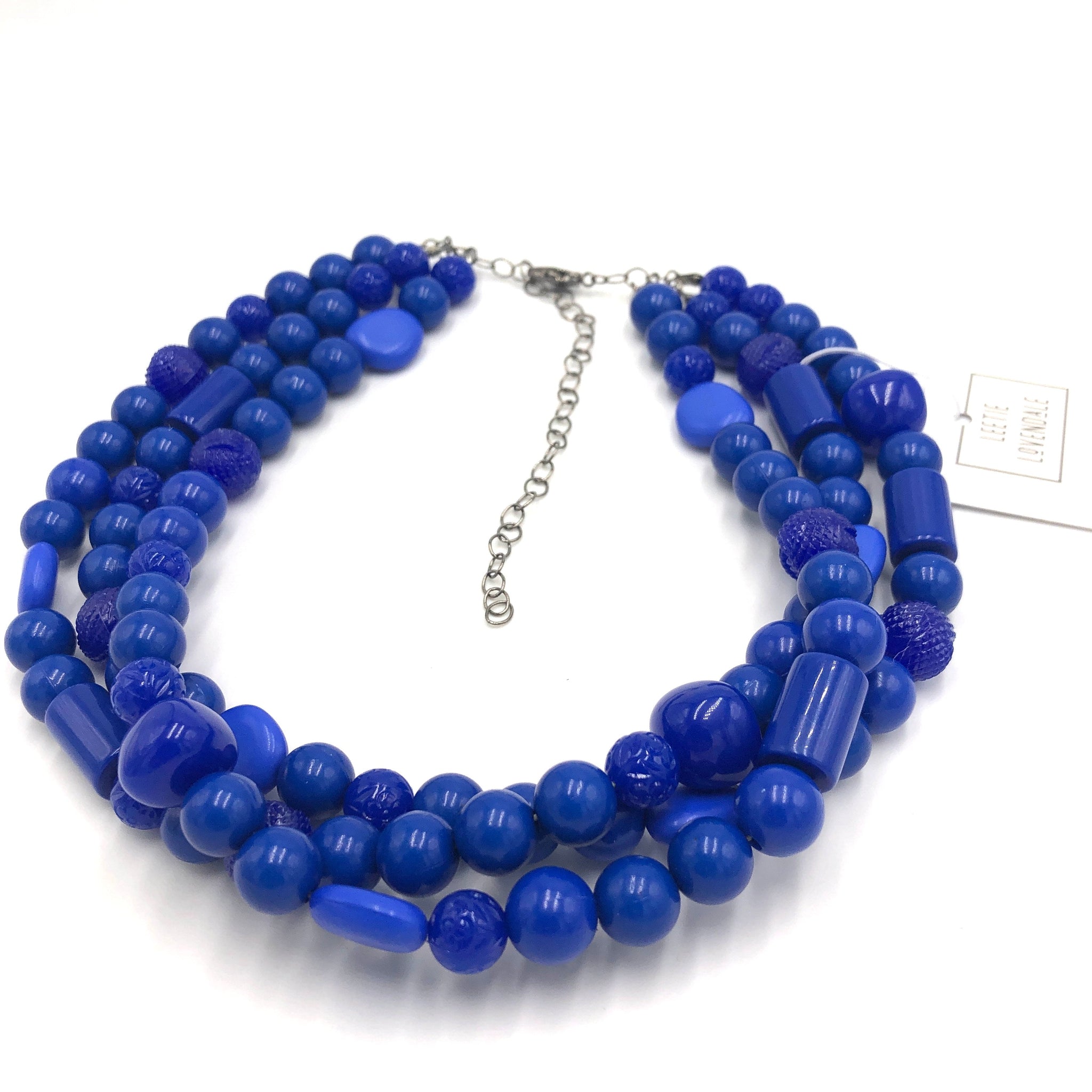 True blue beaded necklace featuring 3 strands of lightweight lucite beads in a shiny opaque finish. This 3 strand statement necklace style is known as the Morgan Necklace. Beads were made in the 1960's. Necklace measures 15.5-16" at it's shortest + a 6" extender. Lightweight and fun to wear: a classic style that will outlast trends. See pic of model wearing the Morgan in another color for size reference.