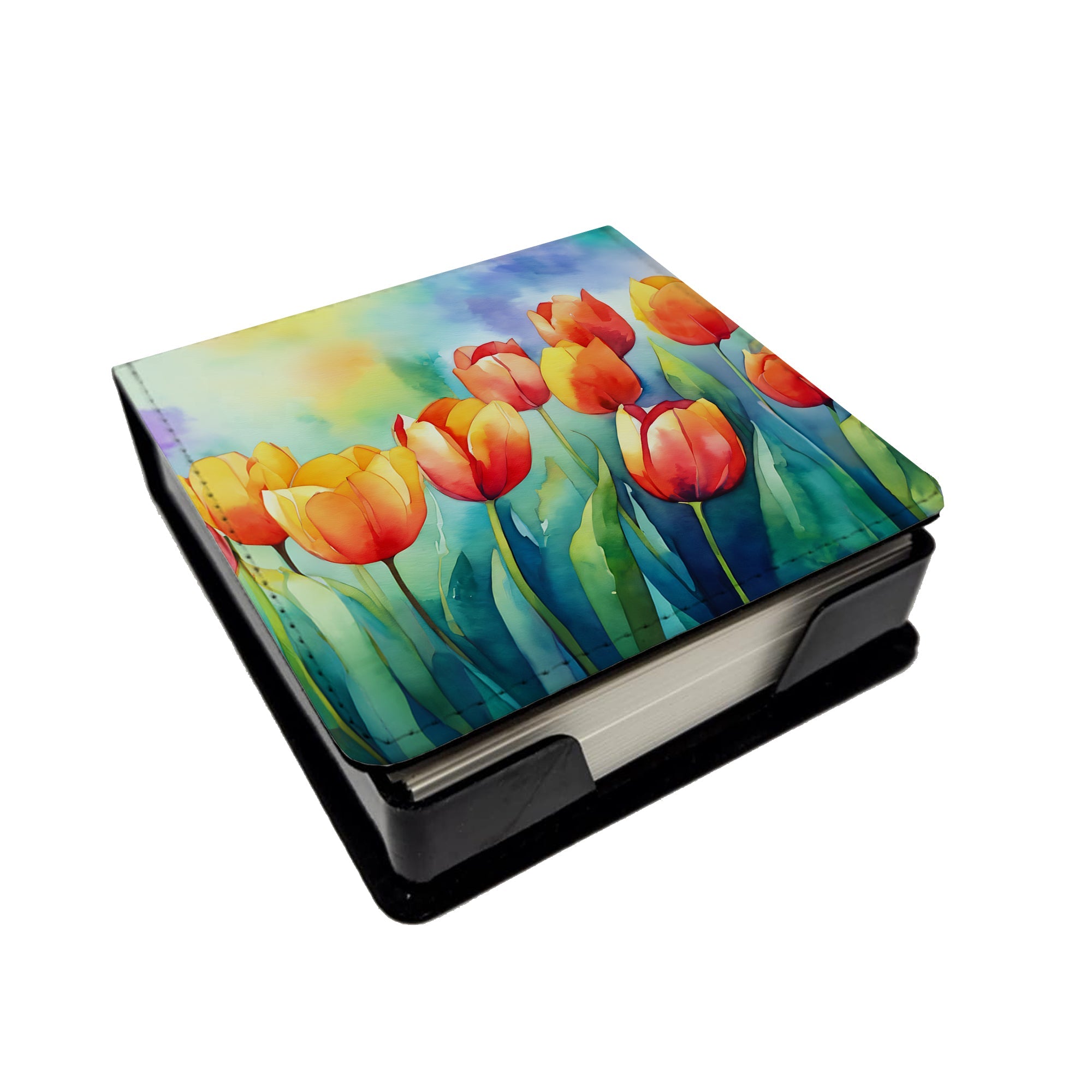 PU Leather Note Paper Holder featuring breed specific Tulips artwork. Elevate your workspace with this PU Leather Note Paper Holder, crafted to resemble luxurious leather without the use of animal products. Made from durable synthetic PU leather, it offers both a premium look and eco-friendly appeal. This note holder, compactly sized at 4.25 x 4.25 x 1.25 inches, includes about 160 sheets of 3.75 x 3.75-inch note paper—ideal for quick notes and reminders. An exclusive artist-designed cover makes each holder uniquely vibrant, adding a splash of color and personality to any desk or office. The discrete design keeps note paper hidden, maintaining a neat and organized workspace. Perfect as a gift or for personal use, this stylish holder is refillable with standard paper, ensuring long-lasting utility. A must-have for anyone seeking a sophisticated, artful touch to their workspace while supporting animal-friendly products. Add style, organization, and creativity to your everyday routine with this elegant note paper holder.