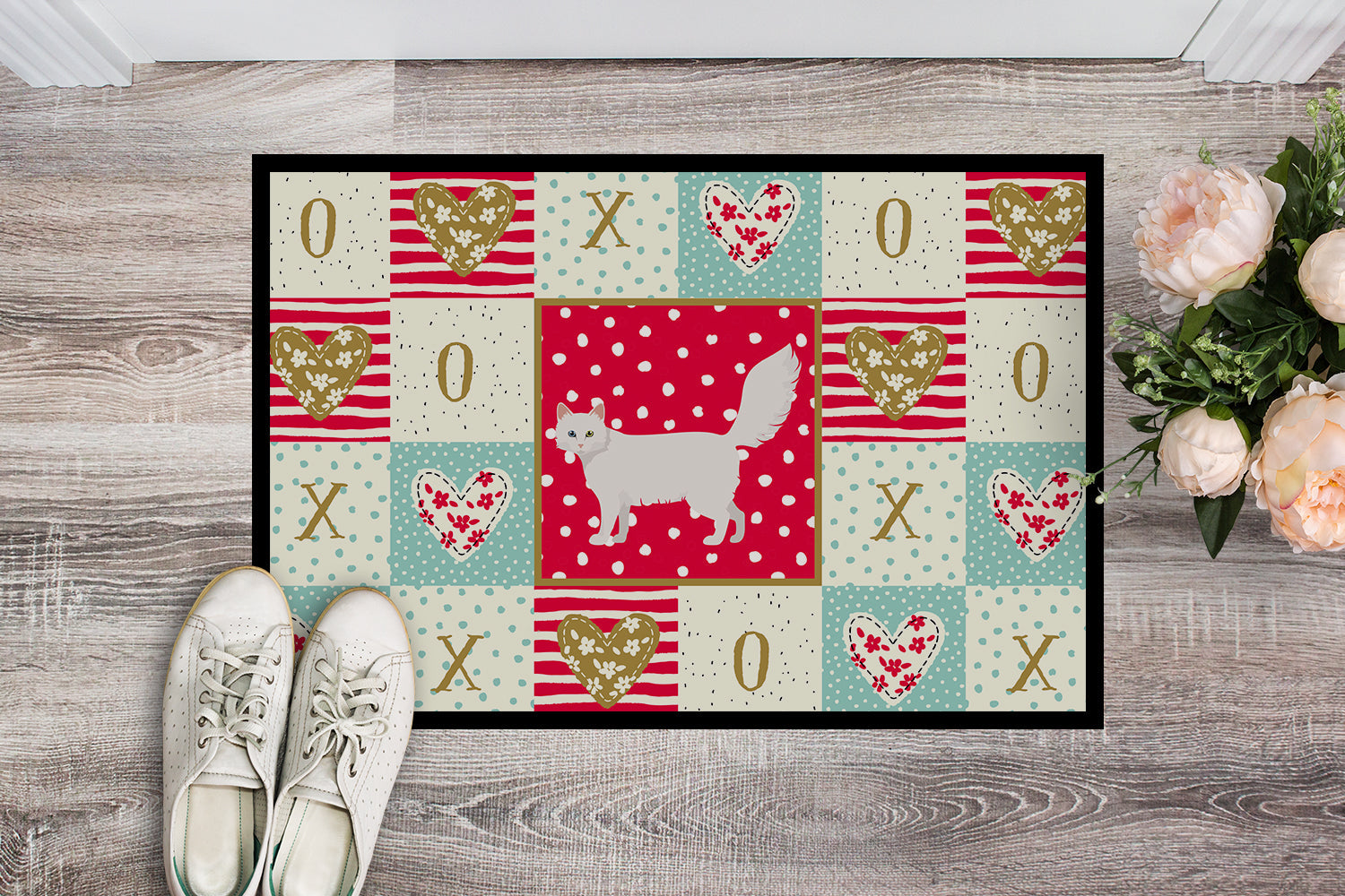 Decorate your space with our Valentine's Day Turkish Angora artwork on a Doormat. Welcome your guests in style with our Artwork Door Mat, designed to withstand almost any weather condition. This mat, measuring approximately 24 by 36 inches, is held together by durable black binding tape. Its top layer, composed of polyester felt, is dyed with the eye-catching image you see on the mat. A few layers below provide the mat with stability, while its rubber bottom is stamped to help prevent slipping and ensures safety. Our mat works wonderfully as both an indoor or outdoor door mat. For cleaning, simply hose it off with water or use a power washer - no need for any cleaner that produces suds. Avoid scrubbing with a brush, instead, opt for the vacuum on floor setting. Designed manufactured and printed in the USA, this mat is a perfect addition to your porch, outdoor kitchen, entryway, or any indoor space. Its unique design makes it a charming decorative rug that greets your guests and adds a stylish touch to your home decor.