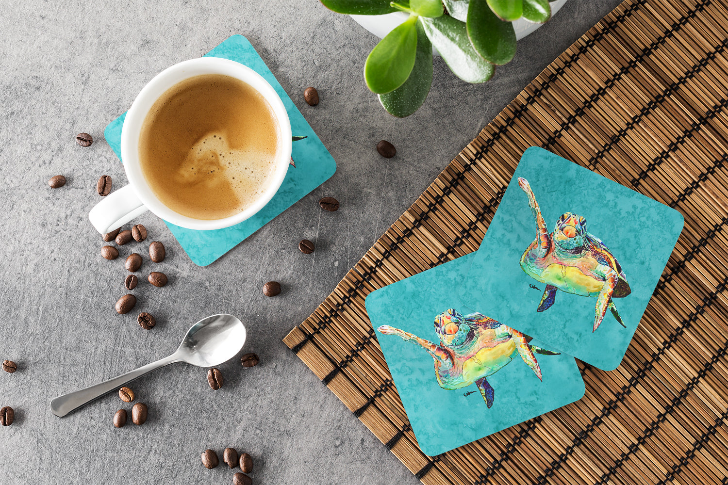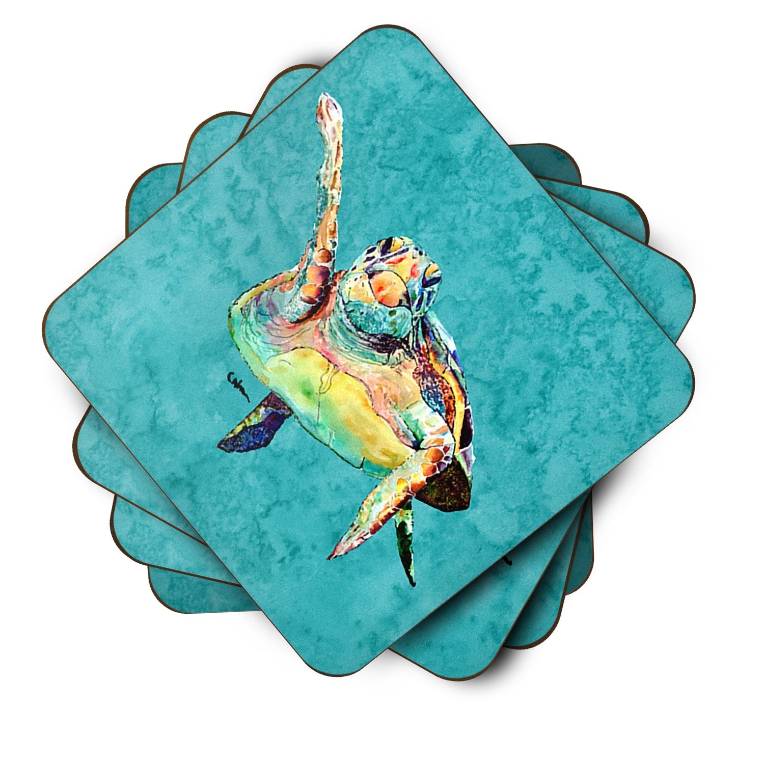 Decorate your space with our Turtle artwork on a Coaster set. Presenting our Set of 4 Foam Coasters, a stylish and practical addition to your table setting. Each square coaster, measuring 3 1/2 inches by 3 1/2 inches, is perfectly sized to accommodate various drinkware, from coffee mugs to tumblers. These coasters stand out with their full-color artwork, permanently dyed onto the material for a vibrant and fade-resistant finish. They're not just functional, they're a fashionable statement, adding a touch of flair to any gathering or event. Our foam coasters serve a dual purpose - they protect your table from water stains and are perfect for both hot and cold drinks. The material used is similar to that of our high-quality mouse pads, ensuring durability and heat resistance. These coasters are easy to maintain - simply wash them in the top of your dishwasher and lay flat to dry. The design won't come off, ensuring they retain their vivid colors for years. Pair them with one of our insulated coolers or huggers for a cohesive, thoughtful gift set. Enhance your beverage experience with our Set of 4 Foam Coasters.