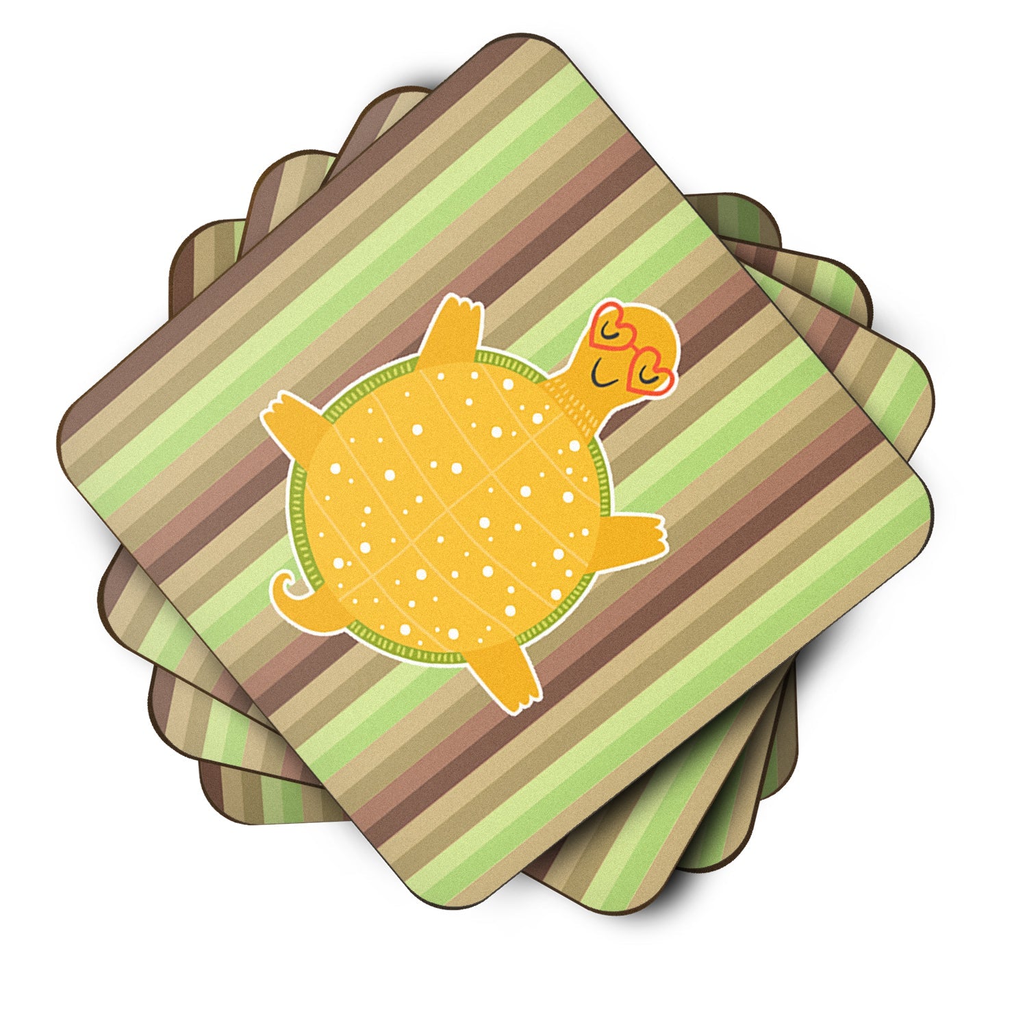 Decorate your space with our Turtle artwork on a Coaster set. Presenting our Set of 4 Foam Coasters, a stylish and practical addition to your table setting. Each square coaster, measuring 3 1/2 inches by 3 1/2 inches, is perfectly sized to accommodate various drinkware, from coffee mugs to tumblers. These coasters stand out with their full-color artwork, permanently dyed onto the material for a vibrant and fade-resistant finish. They're not just functional, they're a fashionable statement, adding a touch of flair to any gathering or event. Our foam coasters serve a dual purpose - they protect your table from water stains and are perfect for both hot and cold drinks. The material used is similar to that of our high-quality mouse pads, ensuring durability and heat resistance. These coasters are easy to maintain - simply wash them in the top of your dishwasher and lay flat to dry. The design won't come off, ensuring they retain their vivid colors for years. Pair them with one of our insulated coolers or huggers for a cohesive, thoughtful gift set. Enhance your beverage experience with our Set of 4 Foam Coasters.