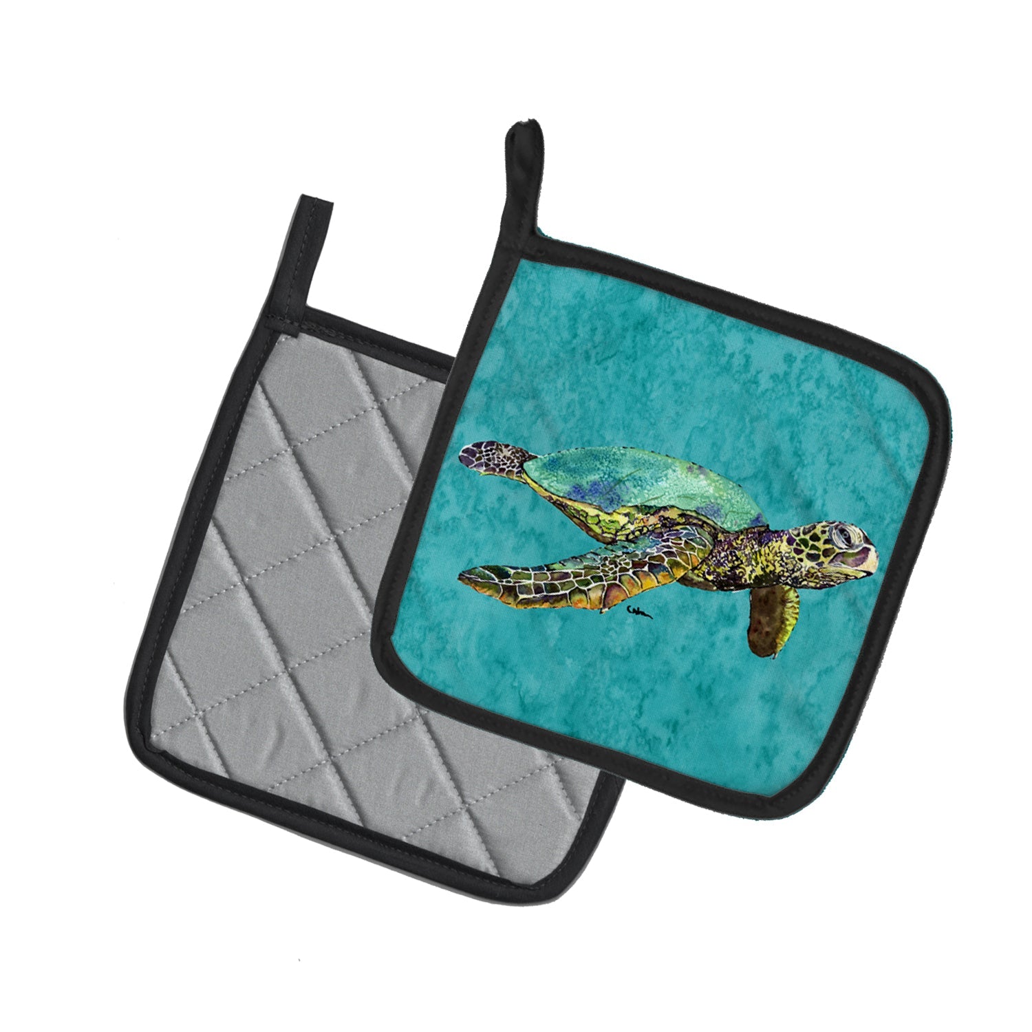 Decorate your space with our Turtle artwork on a Pair of Pot Holders. A Pair of Pot Holders to match your kitchen decor. Made in the USA these are thick and functional. Full color artwork decorates the front polyester fabric of the hot pad and accented by a black trim. Use these at as a trivet for your Thanksgiving or Christmas tablescape. Filled with insulated fabric and quilted for durability. These colorful pot holders will make a great gift for your favorite home cook or executive chef. Each pot holder measures approximately 7 1/2 inches by 7 1/2 inches. A hanging tab is included.