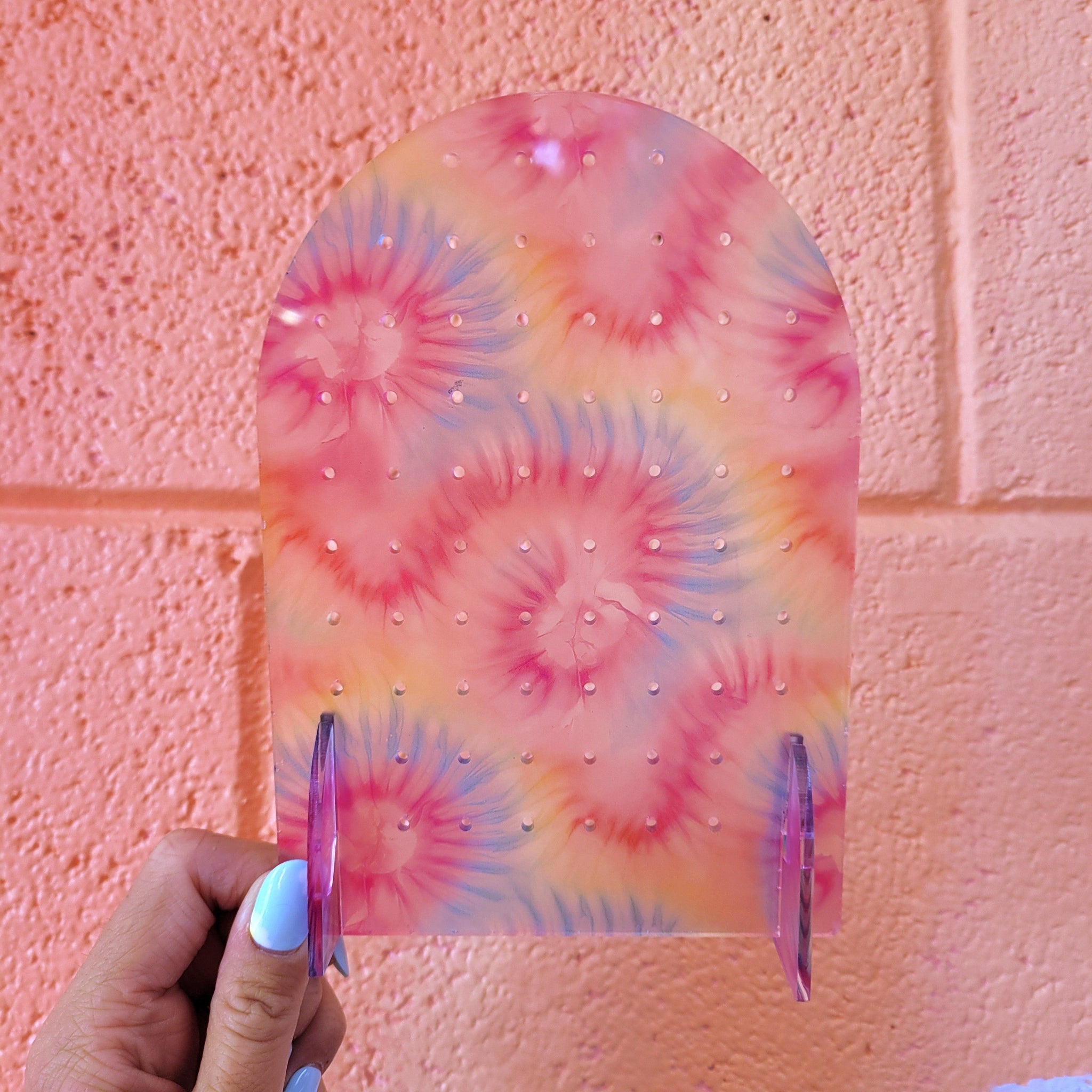 Showcase your favorite earrings in style with this charming display stand featuring a soft pastel rainbow tie-dye finish. Perfect for organizing and presenting your collection, this elegant piece adds a pop of whimsical color to any vanity, shelf, or studio space. The playful gradient design celebrates individuality while keeping your earrings easily accessible and beautifully displayed. A delightful way to turn everyday storage into decorative art.