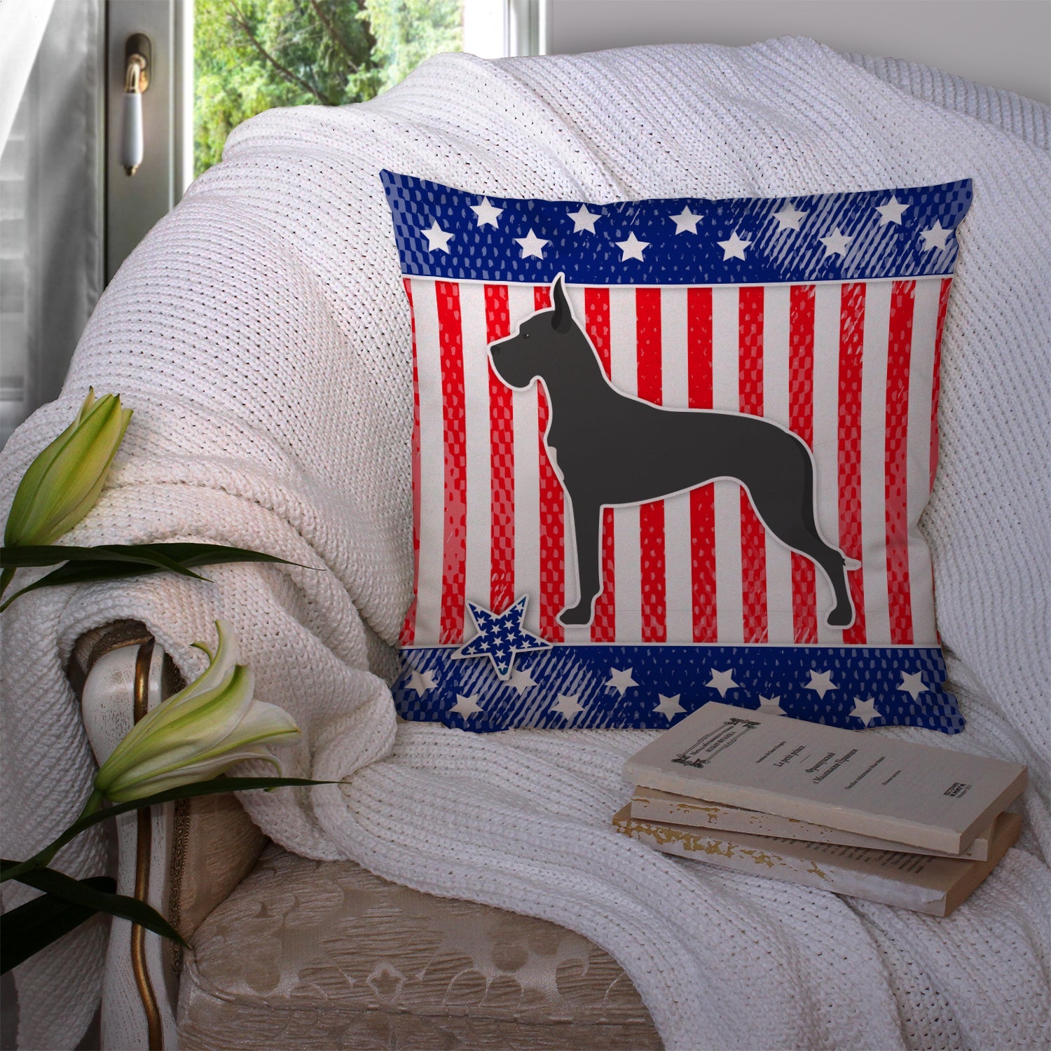 Decorate your space with our Great Dane artwork on a Pillow. Add a touch of vibrancy and comfort to your outdoor seating with Caroline's Treasures Fabric Decorative Pillow. Measuring approximately 14 inches by 14 inches, this outdoor pillow is crafted to elevate the appeal of your patio furniture, infusing it with vivid color and artistic flair. The pillow includes a 100% Polyester Fabric sham filled with a quality pillow form to provide superior comfort. Innovatively made from our brand new material, specifically woven for its water resistance, this pillow is designed for durability. The soft canvas fabric offers versatility in use, fit for your indoor couch or your outdoor patio, porch, or veranda. The fabric is dyed with colorfast dyes built for resilience against weather conditions, ensuring the pillow retains its beauty over time. Constructed by sewing three fabric pieces to create a sham, the polyester insert is then nestled inside to form the pillow, resulting in an overstuffed pillow that maintains its shape. Both the sham and the pillow insert are proudly made in the United States. As the pillows are handcrafted, there may be minor variations in size, further enhancing their unique charm. Experience comfort in style with Caroline's Treasures Fabric Decorative Pillow.
