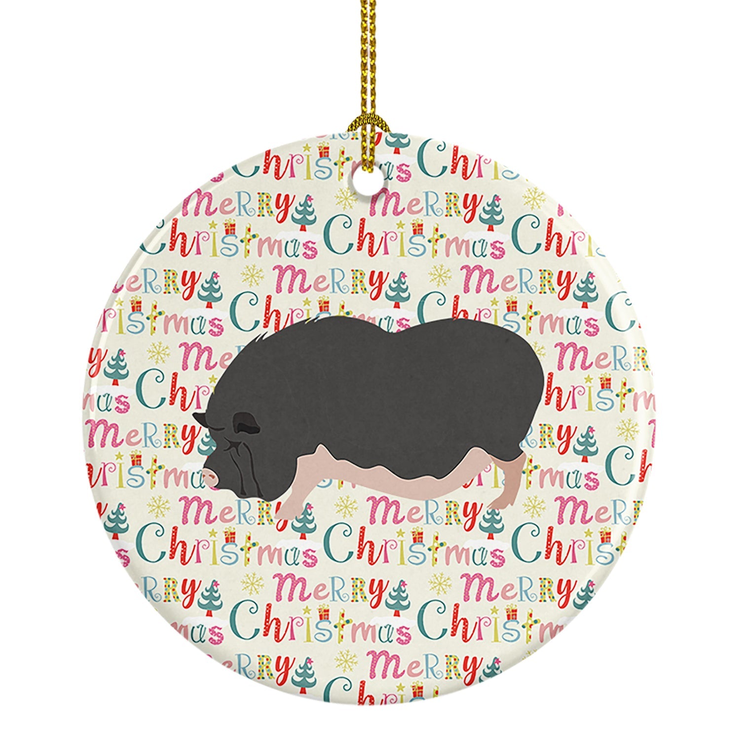 Decorate your space with our Christmas Vietnamese Pot-Bellied Pig artwork on a Ornament. Add a touch of personalized charm to your Christmas tree this holiday season with our Ceramic Ornament. Measuring 2.8125 inches in diameter, this round porcelain ornament beautifully reflects your festive lights, enhancing your holiday decor. The gloss surface sets off the vibrant, full-color artwork contributed by one of our talented artists, bringing a pop of color and joy to your tree. This Ceramic Ornament doesn't stop at being merely decorative. The white back is designed for personalization. Write a heartfelt message, mark a special year, or inscribe a date with a paint pen or a permanent marker to create a treasured memento. Please ensure you allow any personalization to dry thoroughly before handling to maintain the pristine finish. Included with the ornament is a delicate gold cord for easy hanging. Made in the USA, this Ceramic Ornament makes an exceptional gift for a pet sitter, teacher, family member, or anyone you wish to share a little Christmas magic with. With its blend of style, charm, and personal touch, it's a meaningful addition to any Christmas tree.