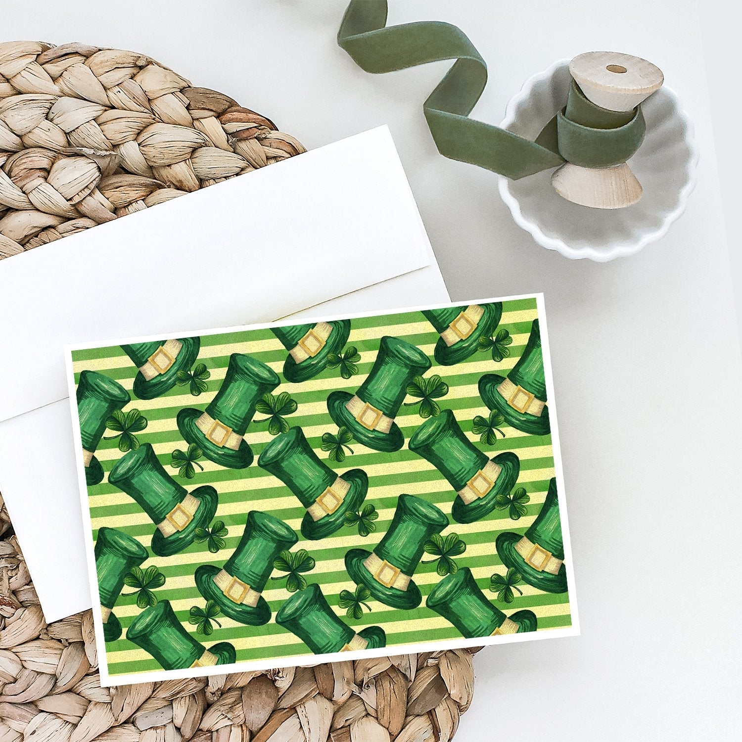 Decorate your space with our St Patrick's Day artwork on a . Celebrate special moments with Caroline's Treasures Printed Greeting Card Pack. This pack includes eight beautifully folded 5x7 cards, accompanied by eight matching white envelopes. With blank interiors, these cards provide ample space for your personalized messages and heartfelt holiday greetings. Each card features captivating full-color artwork, meticulously printed in our facility on high-quality 80 lb cover stock or 216 GSM. The super smooth finish of the white cards enhances the visual impact of the artwork, creating a truly stunning presentation. Designed by our talented in-house artists or licensed artists, the artwork on these cards showcases their creativity and attention to detail. From vibrant illustrations to captivating designs, each card tells its own unique story. Whether it's for birthdays, anniversaries, holidays, or any special occasion, Caroline's Treasures Greeting Card Pack is the perfect way to convey your heartfelt sentiments. Share joy, love, and warm wishes with these exquisite cards and make every moment unforgettable.