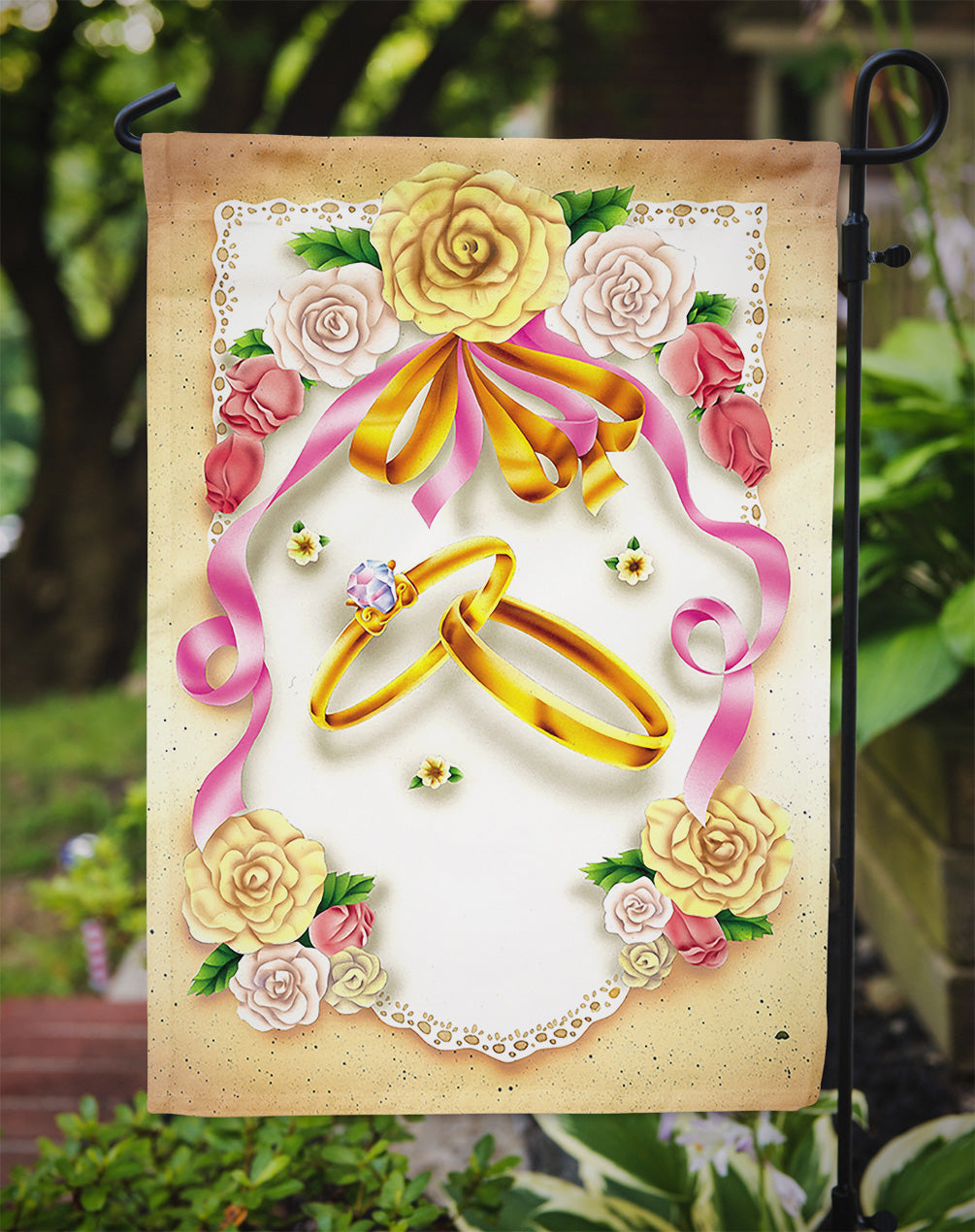 Decorate your space with our Wedding artwork on a Garden Flag. Enhance the beauty of your garden, patio, or yard with Caroline's Treasures Decorative Garden Flag, proudly made in the USA. Crafted from two pieces of thick, double-sided polyester fabric, this 2-ply garden flag is designed to withstand various weather conditions, making it water-resistant and weatherproof. Featuring correctly readable words on both sides, this garden flag offers a delightful visual experience from any angle. With its heavier weight, it stands out among other garden flags, ensuring stability and durability even in wind, rain, and snow. Measuring approximately 11 1/4 inches by 15 1/2 inches, this flag allows you to personalize your outdoor decor. It comes with a 1 1/2-inch sleeve sewn in, allowing easy attachment to any standard garden flag stand or garden size porch hanger (sold separately). Make a statement in your outdoor space with Caroline's Treasures Decorative Garden Flag, a vibrant and high-quality flag that adds color and personality to your surroundings. Proudly made in the USA, it's a symbol of quality craftsmanship and attention to detail.