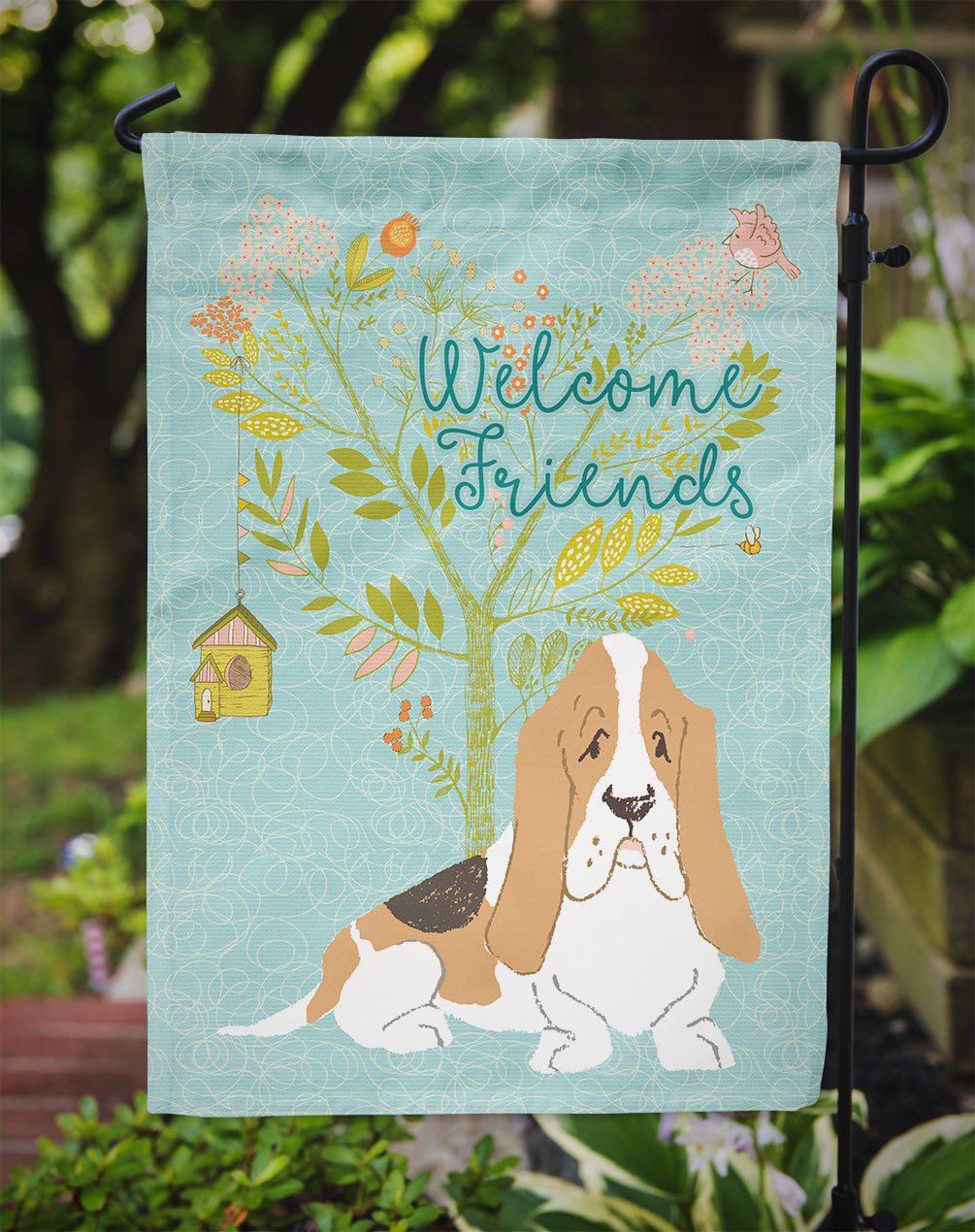 Welcome Friends Basset Hound Garden Flag – Teal Dog Yard Decor with Tree Illustration BB7600GF