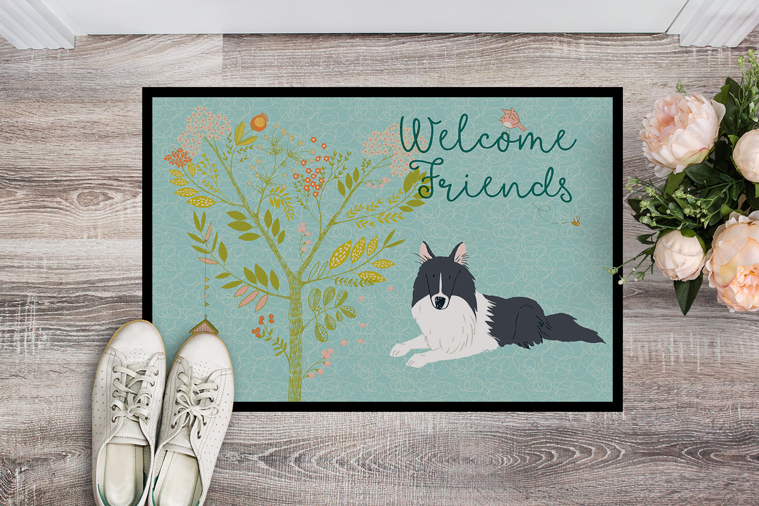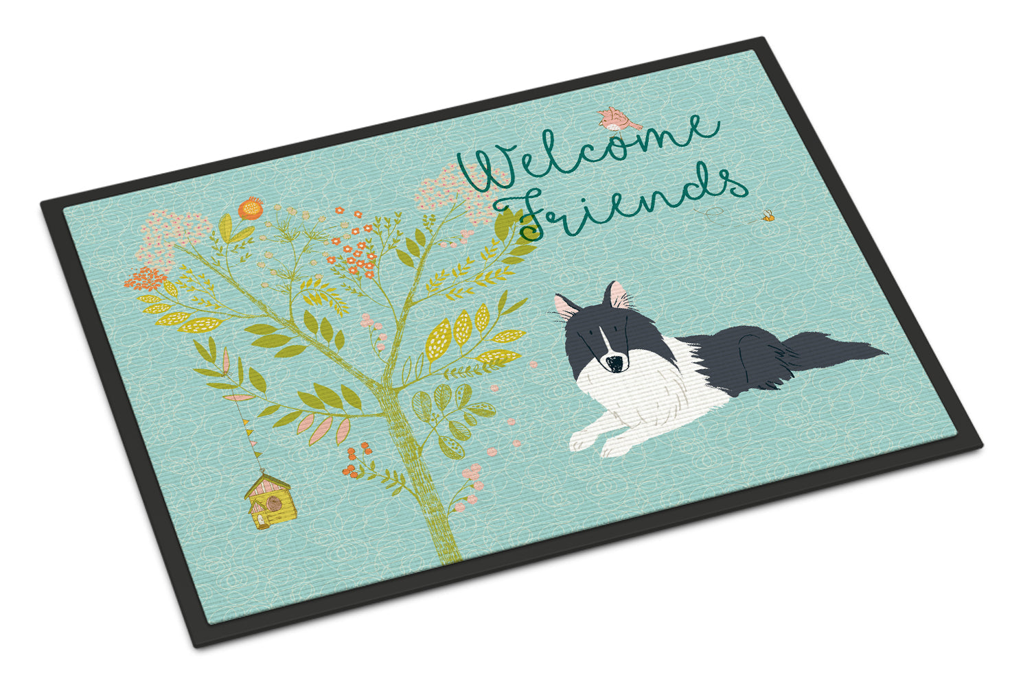 Decorate your space with our Collie artwork on a Doormat. Welcome your guests in style with our Artwork Door Mat, designed to withstand almost any weather condition. This mat, measuring approximately 18 by 27 inches, is held together by durable black binding tape. Its top layer, composed of polyester felt, is dyed with the eye-catching image you see on the mat. A few layers below provide the mat with stability, while its rubber bottom is stamped to help prevent slipping and ensures safety. Our mat works wonderfully as both an indoor or outdoor door mat. For cleaning, simply hose it off with water or use a power washer - no need for any cleaner that produces suds. Avoid scrubbing with a brush, instead, opt for the vacuum on floor setting. Designed manufactured and printed in the USA, this mat is a perfect addition to your porch, outdoor kitchen, entryway, or any indoor space. Its unique design makes it a charming decorative rug that greets your guests and adds a stylish touch to your home decor.