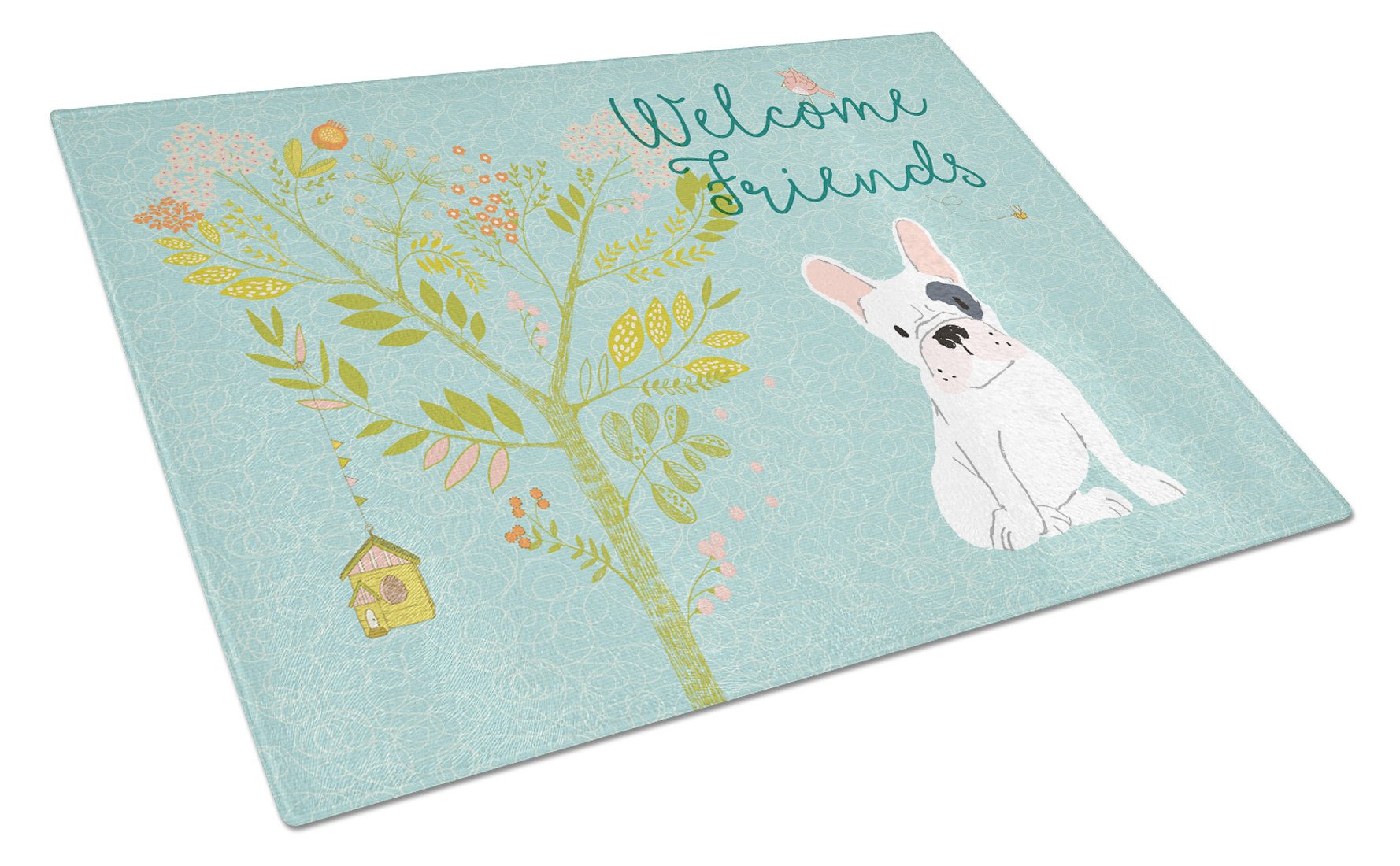 Welcome Friends Piebald French Bulldog Glass Cutting Boards – Durable, Decorative Kitchen Art Large BB7634LCB