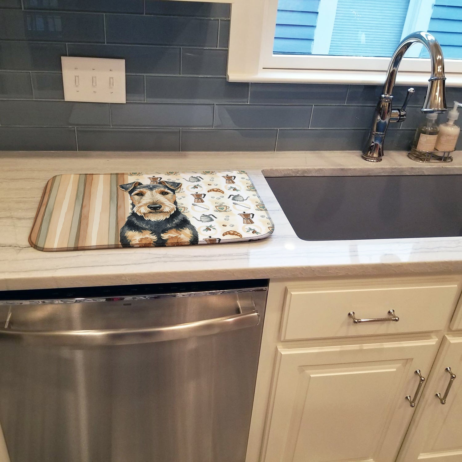 Shown here is the Welsh Terrier Coffee Bar Dish Drying Mat from Caroline's Treasures featuring artwork of a Welsh Terrier in a Everyday design. The detailed illustration and vibrant colors make it a standout accent that celebrates both seasonal style and love for the subject. This image features a cozy watercolor coffee-themed pattern with illustrated mugs, moka pots, kettles, croissants, coffee beans, and sugar cubes arranged in a repeating design. Soft neutral tones with warm browns, creams, and subtle sage accents create an inviting, café-inspired look that feels comforting and relaxed. Everyday décor celebrates personal style and the small moments that make a house feel like home. Thoughtful designs add warmth and personality that can be enjoyed year-round. Say goodbye to messy countertops and soggy dish towels with our innovative dish drying mat. Our high-quality dish drying pad is designed to keep your countertops dry while offering a stylish and efficient solution. Whether you're air drying dishes, glasses, stemware, silverware, pots, pans, bottles, or even fruits and vegetables, our dish mat is the perfect choice. The 14 inches x 21 inches size fits most counters and dish drying racks, and the non-slip design ensures stability. Made with water-absorbent polyester and a polyurethane foam insert, our dish drying mat is not only functional but also durable. It's machine washable and printed in the USA for long-lasting use. The beautiful artwork adds flair to your kitchen decor, making it a perfect housewarming gift or present for any occasion. Upgrade your kitchen experience with our absorbent and versatile dish drying mat. Perfect for: Kitchen counters and sinks, everyday dish drying and countertop protection, Dogs-themed homes, or year-round use for Welsh Terrier lovers. Welsh Terriers are confident dogs known for their spirited personality and alert nature. This hardy terrier breed is admired for its loyalty, intelligence, and independence. Makes a heartfelt gift for: Welsh Terrier owners, Dogs lovers, Everyday gifts, pet parents, friends who adore their Welsh Terrier, or anyone celebrating Dogs.