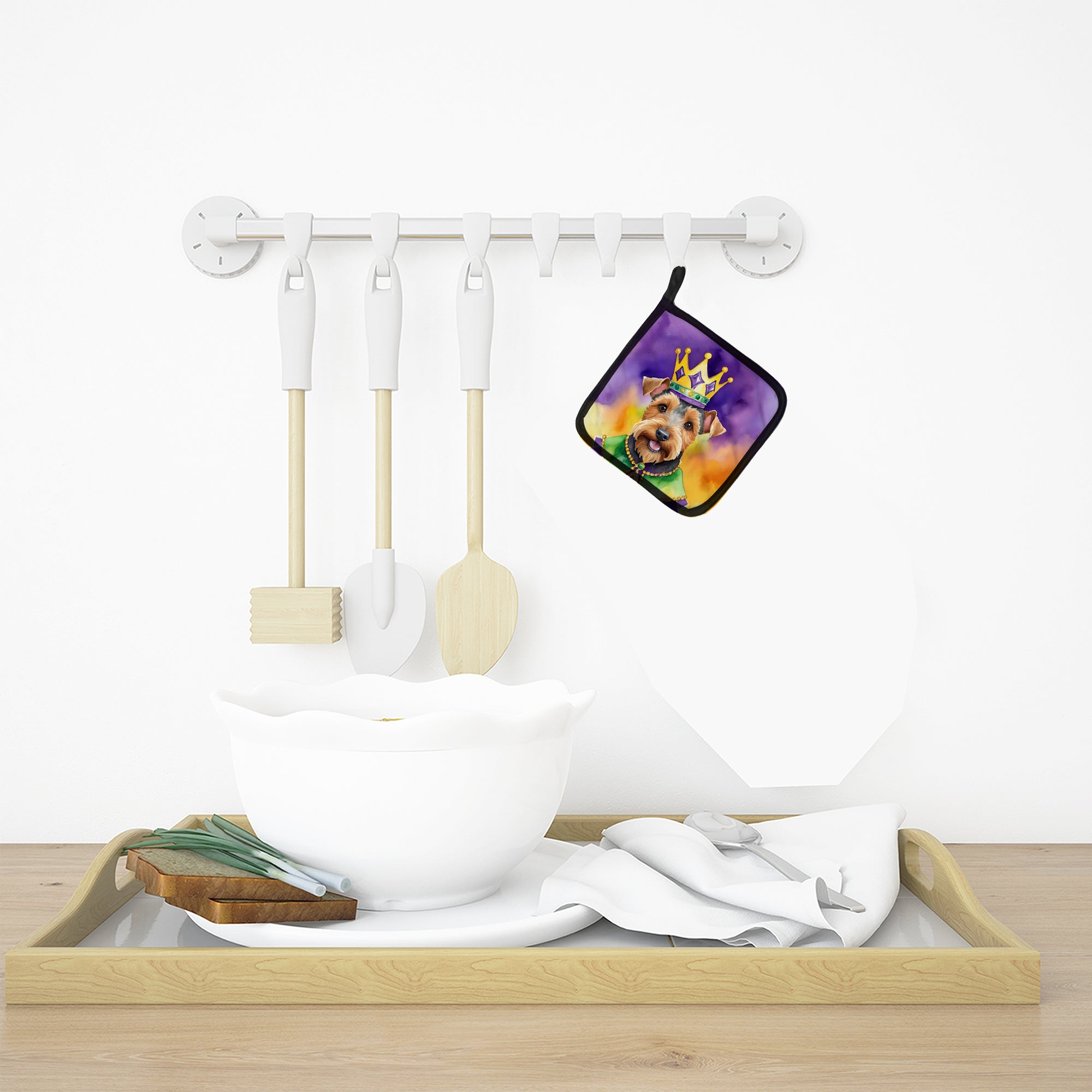 Pair of Pot Holders featuring breed specific Welsh Terrier artwork. Celebrate Mardi Gras with this Mardi Gras Pair of Pot Holders. A Pair of Pot Holders to match your kitchen decor. Made in the USA these are thick and functional. Full color artwork decorates the front polyester fabric of the hot pad and accented by a black trim. Use these at as a trivet for your Thanksgiving or Christmas tablescape. Filled with insulated fabric and quilted for durability. These colorful pot holders will make a great gift for your favorite home cook or executive chef. Each pot holder measures approximately 7 1/2 inches by 7 1/2 inches. A hanging tab is included.