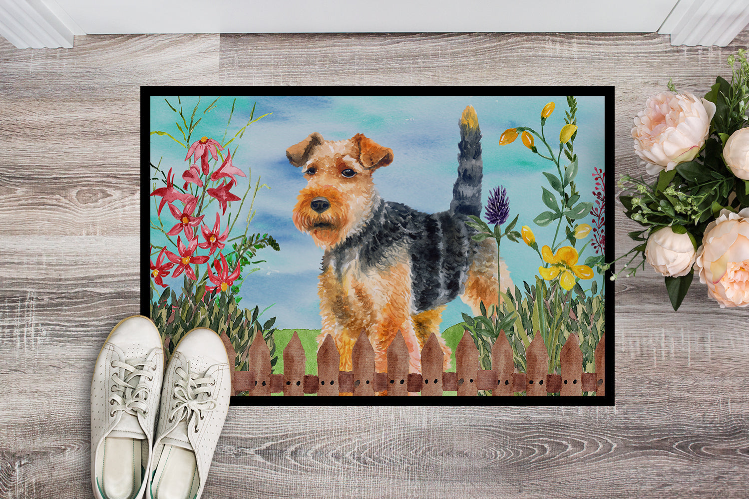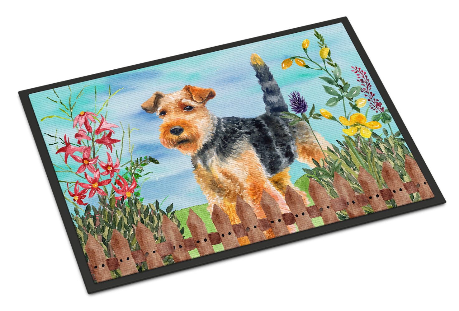 Decorate your space with our Welsh Terrier artwork on a Doormat. Bring a bit of Spring into your home with a Spring Doormat. Welcome your guests in style with our Artwork Door Mat, designed to withstand almost any weather condition. This mat, measuring approximately 18 by 27 inches, is held together by durable black binding tape. Its top layer, composed of polyester felt, is dyed with the eye-catching image you see on the mat. A few layers below provide the mat with stability, while its rubber bottom is stamped to help prevent slipping and ensures safety. Our mat works wonderfully as both an indoor or outdoor door mat. For cleaning, simply hose it off with water or use a power washer - no need for any cleaner that produces suds. Avoid scrubbing with a brush, instead, opt for the vacuum on floor setting. Designed manufactured and printed in the USA, this mat is a perfect addition to your porch, outdoor kitchen, entryway, or any indoor space. Its unique design makes it a charming decorative rug that greets your guests and adds a stylish touch to your home decor.