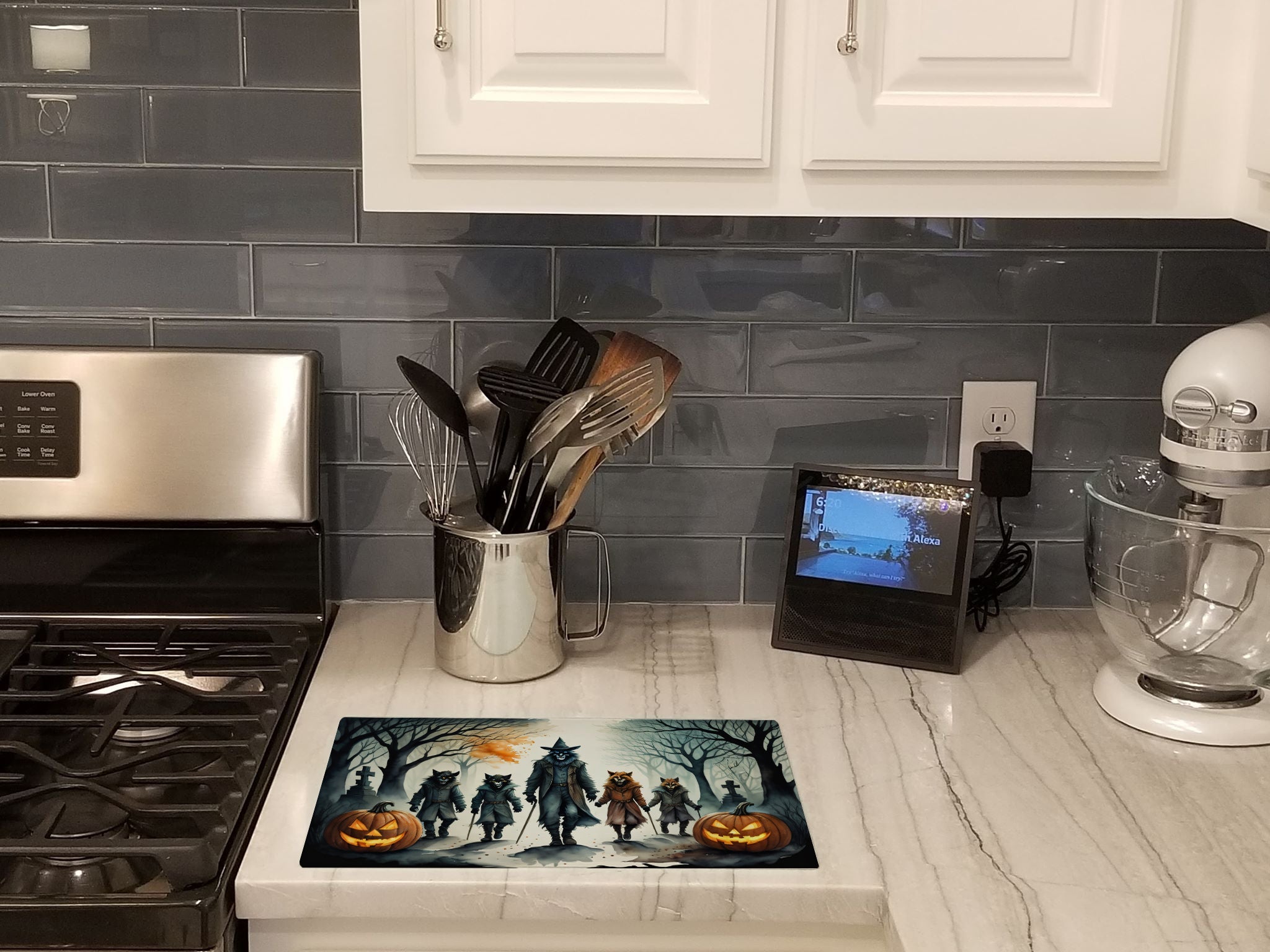 Decorate your space with our Halloween artwork on a Cutting Board. Introduce your kitchen to the vibrant, large Decorative Glass Cutting Board from Caroline's Treasures. Crafted from resilient tempered glass, this board is not only a utilitarian necessity but also a colorful art piece. With its generous dimensions of 15 inches in height and 12 inches in length, it offers ample space for all your cutting needs. Every piece showcases captivating artwork from distinguished artists, bringing an aesthetic edge to your kitchen. Beyond its attractive design, this cutting board ensures your countertop stays pristine and unscathed, owing to its heat-resistant properties. Engineered with user convenience in mind, it features non-skid feet for stability, and rounded corners for additional safety. Its robust construction renders it virtually unbreakable, guaranteeing longevity. The board comes with protective feet bumpers, maintaining its position during use. This product is recommended to be hand washed only. Proudly printed and assembled in the United States, this cutting board exemplifies superior craftsmanship. With Caroline's Treasures' Decorative Glass Cutting Board, you're investing in a blend of functionality and artistic flair.