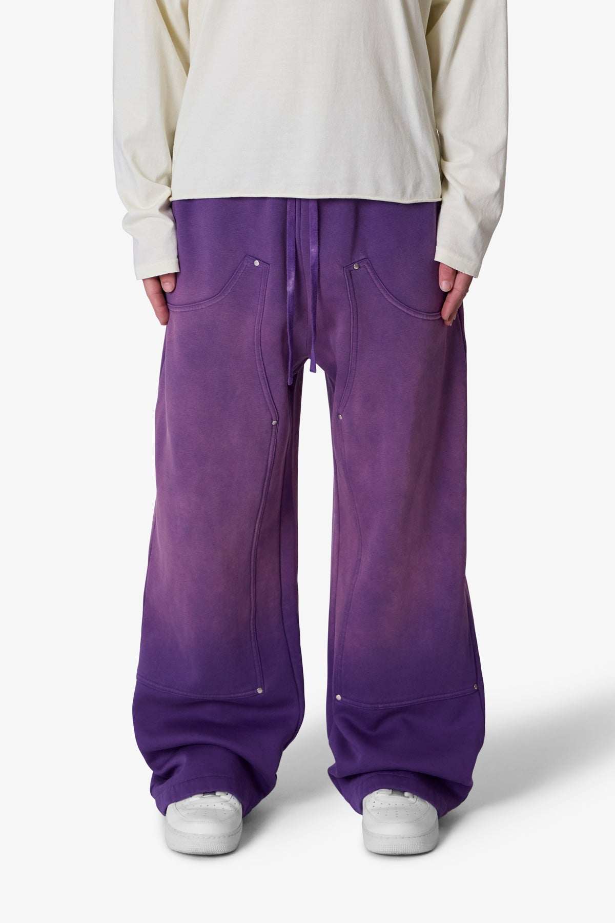 the West Double Knee Sweatpants are made from a 100% cotton fabric for unmatched quality and comfort. Featuring a dyed and faded gradient wash, double knee lining with western studding, and a relaxed yet refined fit with a slight flair at the leg opening.