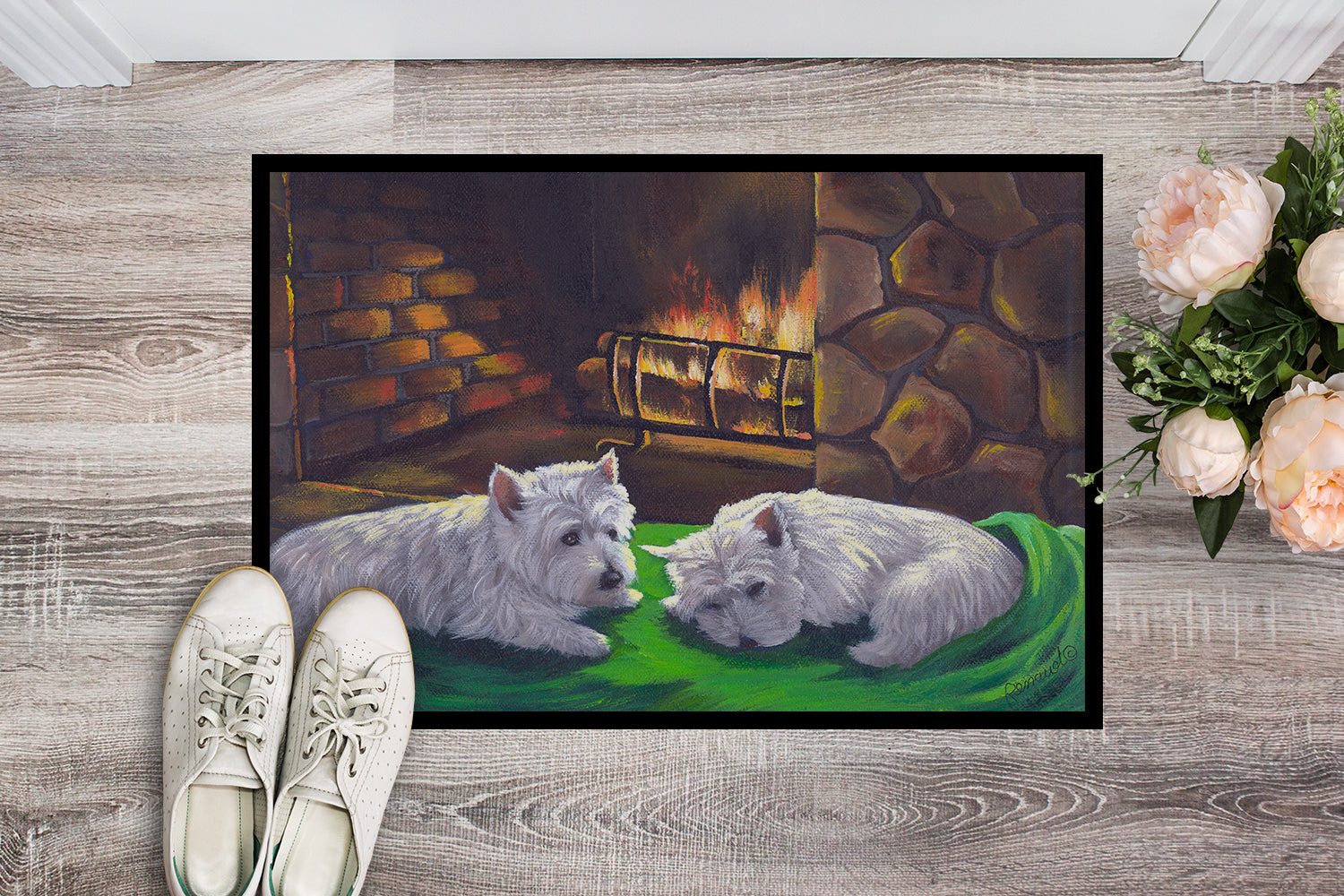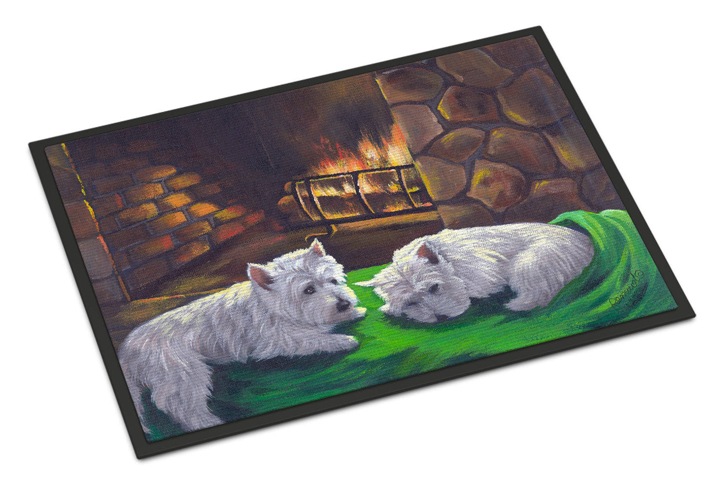 Decorate your space with our Christmas West Highland White Terrier artwork on a Doormat. Bring a bit of Winter into your home with a Winter Doormat. Welcome your guests in style with our Artwork Door Mat, designed to withstand almost any weather condition. This mat, measuring approximately 18 by 27 inches, is held together by durable black binding tape. Its top layer, composed of polyester felt, is dyed with the eye-catching image you see on the mat. A few layers below provide the mat with stability, while its rubber bottom is stamped to help prevent slipping and ensures safety. Our mat works wonderfully as both an indoor or outdoor door mat. For cleaning, simply hose it off with water or use a power washer - no need for any cleaner that produces suds. Avoid scrubbing with a brush, instead, opt for the vacuum on floor setting. Designed manufactured and printed in the USA, this mat is a perfect addition to your porch, outdoor kitchen, entryway, or any indoor space. Its unique design makes it a charming decorative rug that greets your guests and adds a stylish touch to your home decor.