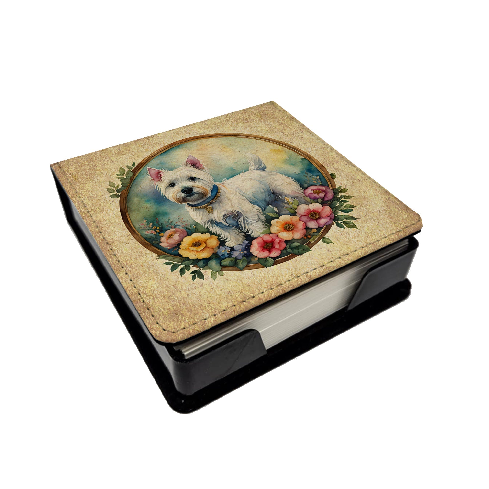 PU Leather Note Paper Holder featuring breed specific West Highland White Terrier artwork. Elevate your workspace with this PU Leather Note Paper Holder, crafted to resemble luxurious leather without the use of animal products. Made from durable synthetic PU leather, it offers both a premium look and eco-friendly appeal. This note holder, compactly sized at 4.25 x 4.25 x 1.25 inches, includes about 160 sheets of 3.75 x 3.75-inch note paper—ideal for quick notes and reminders. An exclusive artist-designed cover makes each holder uniquely vibrant, adding a splash of color and personality to any desk or office. The discrete design keeps note paper hidden, maintaining a neat and organized workspace. Perfect as a gift or for personal use, this stylish holder is refillable with standard paper, ensuring long-lasting utility. A must-have for anyone seeking a sophisticated, artful touch to their workspace while supporting animal-friendly products. Add style, organization, and creativity to your everyday routine with this elegant note paper holder.