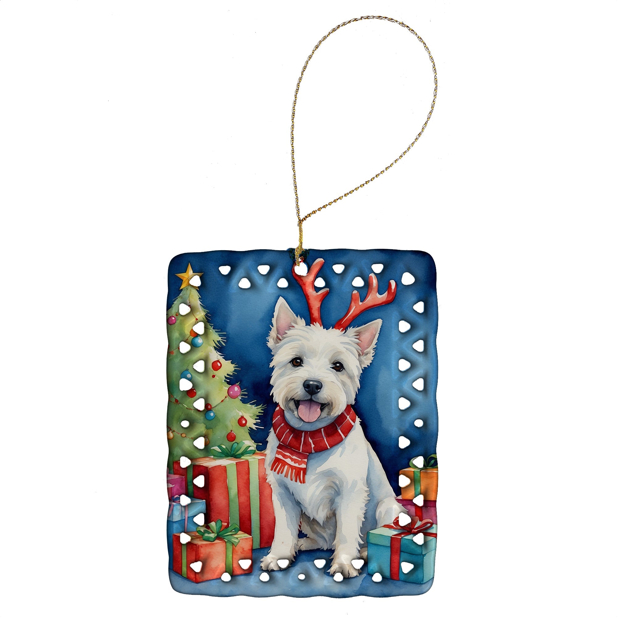 Porcelain Ornament featuring breed specific West Highland White Terrier artwork. Celebrate Christmas with this Christmas Ornament. Add a unique, personal touch to your holiday decor with our Rectangular Lattice Porcelain Ornament. Perfect for creating cherished memories, this high-quality ornament shines under festive lights, reflecting warmth and joy throughout your Christmas tree. Crafted with a glossy finish, it showcases vibrant, full-color artwork contributed by our talented artists, ensuring your tree is adorned with a burst of color and holiday spirit. What sets this Porcelain Ornament apart is its customizable white back. Use a paint pen or permanent marker to write a heartfelt message, commemorate a special year, or mark an unforgettable date, turning this ornament into a keepsake that will be treasured for years to come. For best results, allow any personalization to dry thoroughly before handling. Each ornament comes complete with a delicate gold cord, making it easy to hang and display. Proudly made in the USA, this ornament measures 3.375 x 2.625 inches and is a thoughtful gift for pet sitters, teachers, family members, or anyone who would appreciate a little extra holiday magic. Bring style, charm, and a touch of personal meaning to your Christmas tree with this beautifully designed ornament..