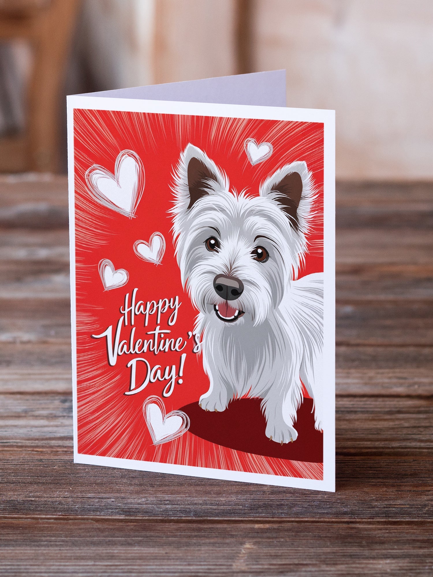 Greeting Cards Pack of 8 featuring breed specific West Highland White Terrier artwork. Celebrate Valentine's Day with this Valentine's Day . Celebrate special moments with Caroline's Treasures Printed Greeting Card Pack. This pack includes eight beautifully folded 5x7 cards, accompanied by eight matching white envelopes. With blank interiors, these cards provide ample space for your personalized messages and heartfelt holiday greetings. Each card features captivating full-color artwork, meticulously printed in our facility on high-quality 80 lb cover stock or 216 GSM. The super smooth finish of the white cards enhances the visual impact of the artwork, creating a truly stunning presentation. Designed by our talented in-house artists or licensed artists, the artwork on these cards showcases their creativity and attention to detail. From vibrant illustrations to captivating designs, each card tells its own unique story. Whether it's for birthdays, anniversaries, holidays, or any special occasion, Caroline's Treasures Greeting Card Pack is the perfect way to convey your heartfelt sentiments. Share joy, love, and warm wishes with these exquisite cards and make every moment unforgettable.