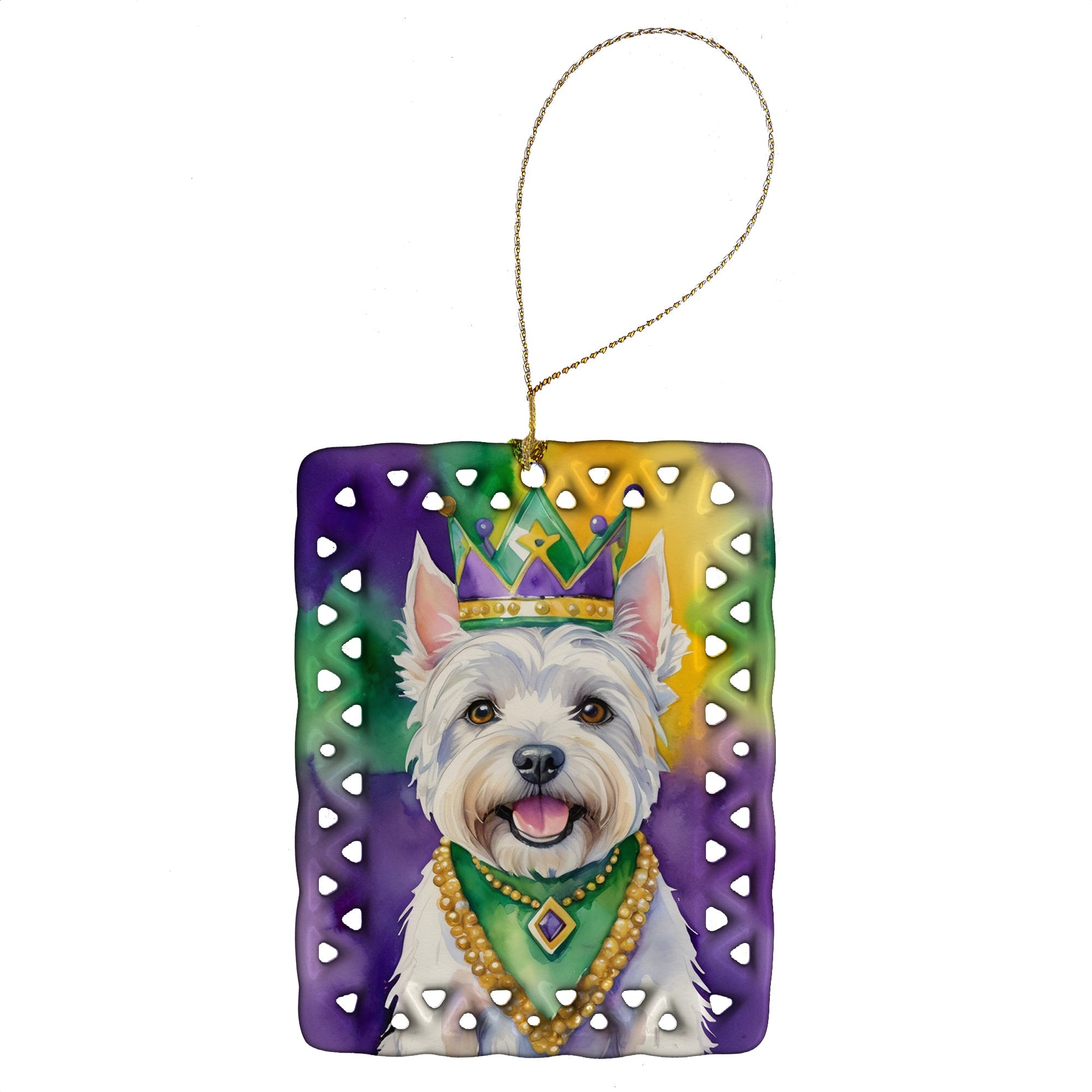 Porcelain Ornament featuring breed specific West Highland White Terrier artwork. Celebrate Mardi Gras with this Mardi Gras Ornament. Add a unique, personal touch to your holiday decor with our Rectangular Lattice Porcelain Ornament. Perfect for creating cherished memories, this high-quality ornament shines under festive lights, reflecting warmth and joy throughout your Christmas tree. Crafted with a glossy finish, it showcases vibrant, full-color artwork contributed by our talented artists, ensuring your tree is adorned with a burst of color and holiday spirit. What sets this Porcelain Ornament apart is its customizable white back. Use a paint pen or permanent marker to write a heartfelt message, commemorate a special year, or mark an unforgettable date, turning this ornament into a keepsake that will be treasured for years to come. For best results, allow any personalization to dry thoroughly before handling. Each ornament comes complete with a delicate gold cord, making it easy to hang and display. Proudly made in the USA, this ornament measures 3.375 x 2.625 inches and is a thoughtful gift for pet sitters, teachers, family members, or anyone who would appreciate a little extra holiday magic. Bring style, charm, and a touch of personal meaning to your Christmas tree with this beautifully designed ornament..