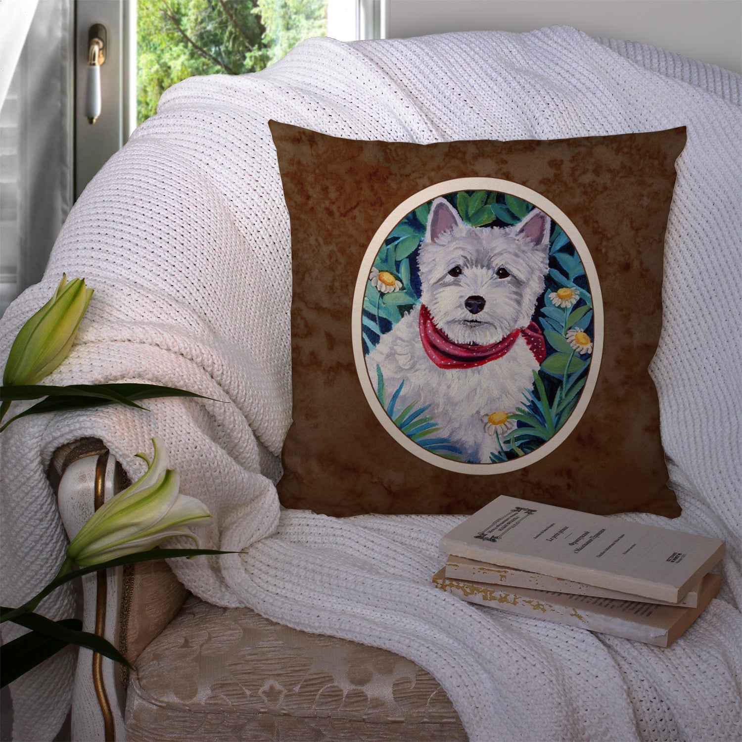 Decorate your space with our West Highland White Terrier artwork on a Pillow. Add a touch of vibrancy and comfort to your outdoor seating with Caroline's Treasures Fabric Decorative Pillow. Measuring approximately 14 inches by 14 inches, this outdoor pillow is crafted to elevate the appeal of your patio furniture, infusing it with vivid color and artistic flair. The pillow includes a 100% Polyester Fabric sham filled with a quality pillow form to provide superior comfort. Innovatively made from our brand new material, specifically woven for its water resistance, this pillow is designed for durability. The soft canvas fabric offers versatility in use, fit for your indoor couch or your outdoor patio, porch, or veranda. The fabric is dyed with colorfast dyes built for resilience against weather conditions, ensuring the pillow retains its beauty over time. Constructed by sewing three fabric pieces to create a sham, the polyester insert is then nestled inside to form the pillow, resulting in an overstuffed pillow that maintains its shape. Both the sham and the pillow insert are proudly made in the United States. As the pillows are handcrafted, there may be minor variations in size, further enhancing their unique charm. Experience comfort in style with Caroline's Treasures Fabric Decorative Pillow.
