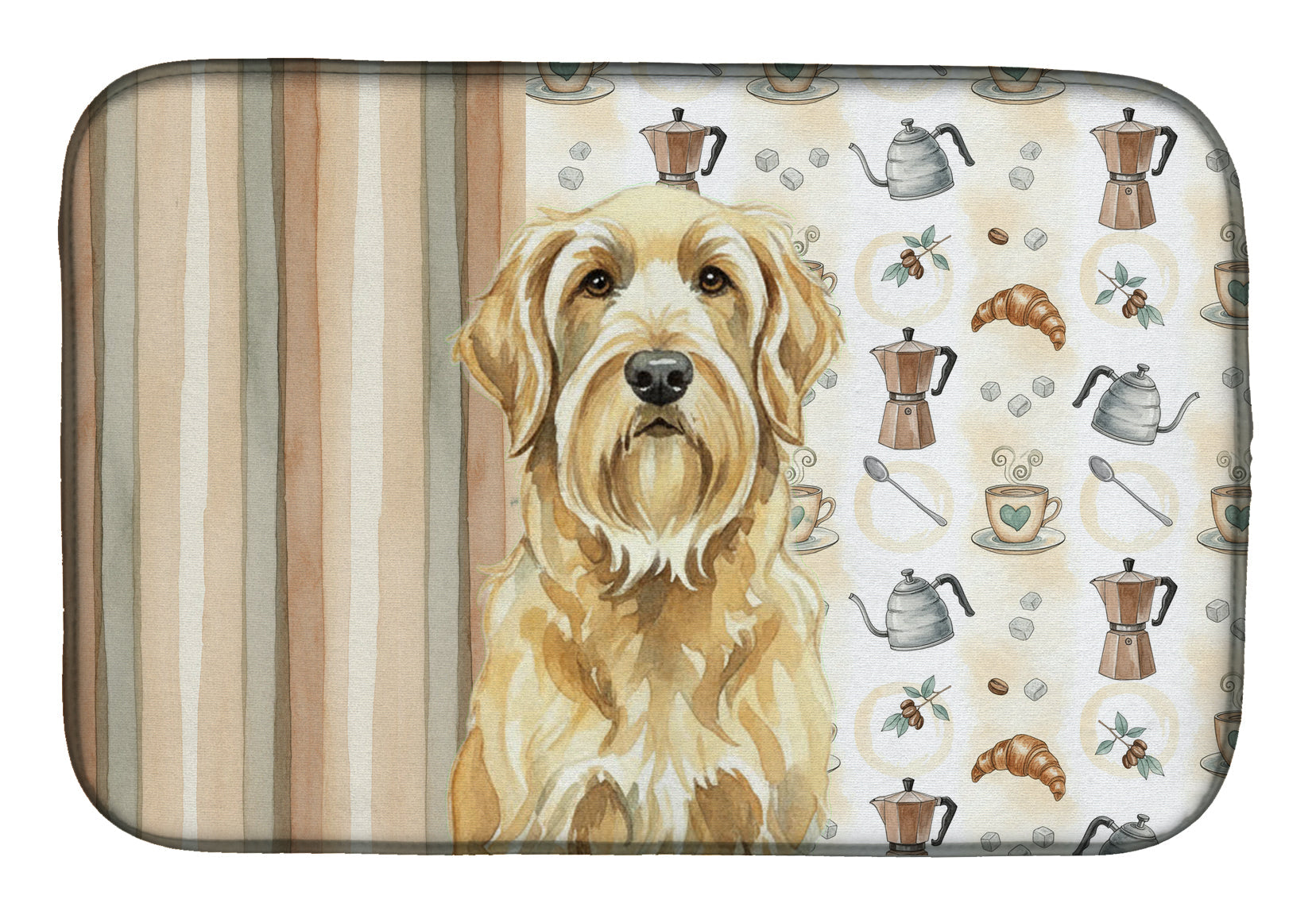 Shown here is the Wheaten and Tan Otterhound Coffee Bar Dish Drying Mat from Caroline's Treasures featuring artwork of a Otterhound in a Everyday design. The detailed illustration and vibrant colors make it a standout accent that celebrates both seasonal style and love for the subject. This image features a cozy watercolor coffee-themed pattern with illustrated mugs, moka pots, kettles, croissants, coffee beans, and sugar cubes arranged in a repeating design. Soft neutral tones with warm browns, creams, and subtle sage accents create an inviting, café-inspired look that feels comforting and relaxed. Everyday décor celebrates personal style and the small moments that make a house feel like home. Thoughtful designs add warmth and personality that can be enjoyed year-round. Say goodbye to messy countertops and soggy dish towels with our innovative dish drying mat. Our high-quality dish drying pad is designed to keep your countertops dry while offering a stylish and efficient solution. Whether you're air drying dishes, glasses, stemware, silverware, pots, pans, bottles, or even fruits and vegetables, our dish mat is the perfect choice. The 14 inches x 21 inches size fits most counters and dish drying racks, and the non-slip design ensures stability. Made with water-absorbent polyester and a polyurethane foam insert, our dish drying mat is not only functional but also durable. It's machine washable and printed in the USA for long-lasting use. The beautiful artwork adds flair to your kitchen decor, making it a perfect housewarming gift or present for any occasion. Upgrade your kitchen experience with our absorbent and versatile dish drying mat. Perfect for: Kitchen counters and sinks, everyday dish drying and countertop protection, Dogs-themed homes, or year-round use for Otterhound lovers. Otterhounds are large scent hounds known for their endurance and love of water. This rare breed is admired for its friendly personality, determination, and distinctive appearance. Makes a heartfelt gift for: Otterhound owners, Dogs lovers, Everyday gifts, pet parents, friends who adore their Otterhound, or anyone celebrating Dogs.