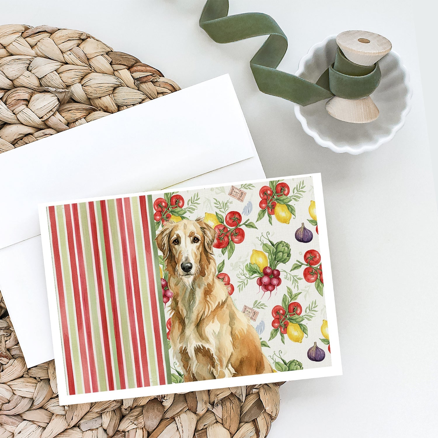 Shown here is the Wheaten Scottish Deerhound Vegetables Greeting Cards Pack of 8 from Caroline's Treasures featuring artwork of a Scottish Deerhound in a Everyday design. The detailed illustration and vibrant colors make it a standout accent that celebrates both seasonal style and love for the subject. This image features a vibrant watercolor vegetable pattern with tomatoes, lemons, artichokes, figs, radishes, and leafy greens arranged in a repeating design, paired with classic red and green stripes. The bright, garden-fresh palette creates a cheerful, farmhouse-inspired look that feels lively, welcoming, and perfect for kitchen décor. Everyday décor celebrates personal style and the small moments that make a house feel like home. Thoughtful designs add warmth and personality that can be enjoyed year-round. Celebrate special moments with Caroline's Treasures Printed Greeting Card Pack. This pack includes eight beautifully folded 5x7 cards, accompanied by eight matching white envelopes. With blank interiors, these cards provide ample space for your personalized messages and heartfelt holiday greetings. Each card features captivating full-color artwork, meticulously printed in our facility on high-quality 80 lb cover stock or 216 GSM. The super smooth finish of the white cards enhances the visual impact of the artwork, creating a truly stunning presentation. Designed by our talented in-house artists or licensed artists, the artwork on these cards showcases their creativity and attention to detail. From vibrant illustrations to captivating designs, each card tells its own unique story. Whether it's for birthdays, anniversaries, holidays, or any special occasion, Caroline's Treasures Greeting Card Pack is the perfect way to convey your heartfelt sentiments. Share joy, love, and warm wishes with these exquisite cards and make every moment unforgettable. Perfect for: Writing personal messages, everyday correspondence, and thoughtful notes, Dogs-themed stationery collections, or year-round use for Scottish Deerhound lovers. Scottish Deerhounds are large sighthounds known for their grace and calm demeanor. This noble breed is admired for its gentle temperament and quiet strength. Makes a heartfelt gift for: Scottish Deerhound owners, Dogs lovers, Everyday gifts, pet parents, friends who adore their Scottish Deerhound, or anyone celebrating Dogs.