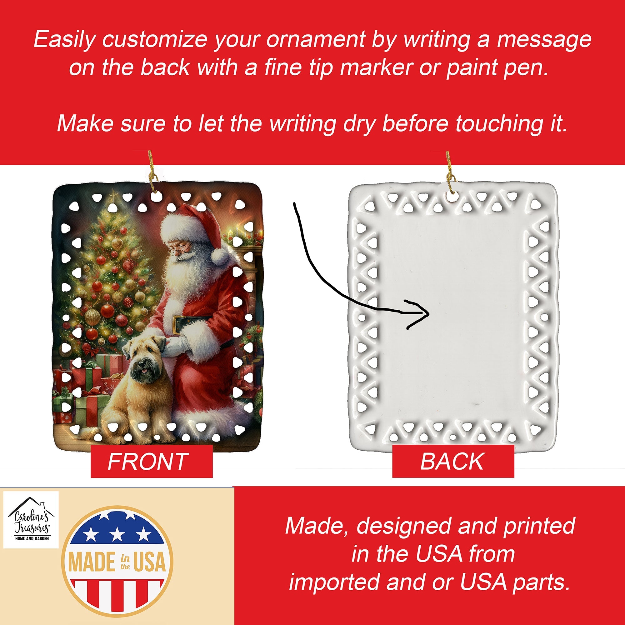 Porcelain Ornament featuring breed specific Wheaten Terrier artwork. Celebrate Christmas with this Christmas Ornament. Add a unique, personal touch to your holiday decor with our Rectangular Lattice Porcelain Ornament. Perfect for creating cherished memories, this high-quality ornament shines under festive lights, reflecting warmth and joy throughout your Christmas tree. Crafted with a glossy finish, it showcases vibrant, full-color artwork contributed by our talented artists, ensuring your tree is adorned with a burst of color and holiday spirit. What sets this Porcelain Ornament apart is its customizable white back. Use a paint pen or permanent marker to write a heartfelt message, commemorate a special year, or mark an unforgettable date, turning this ornament into a keepsake that will be treasured for years to come. For best results, allow any personalization to dry thoroughly before handling. Each ornament comes complete with a delicate gold cord, making it easy to hang and display. Proudly made in the USA, this ornament measures 3.375 x 2.625 inches and is a thoughtful gift for pet sitters, teachers, family members, or anyone who would appreciate a little extra holiday magic. Bring style, charm, and a touch of personal meaning to your Christmas tree with this beautifully designed ornament..