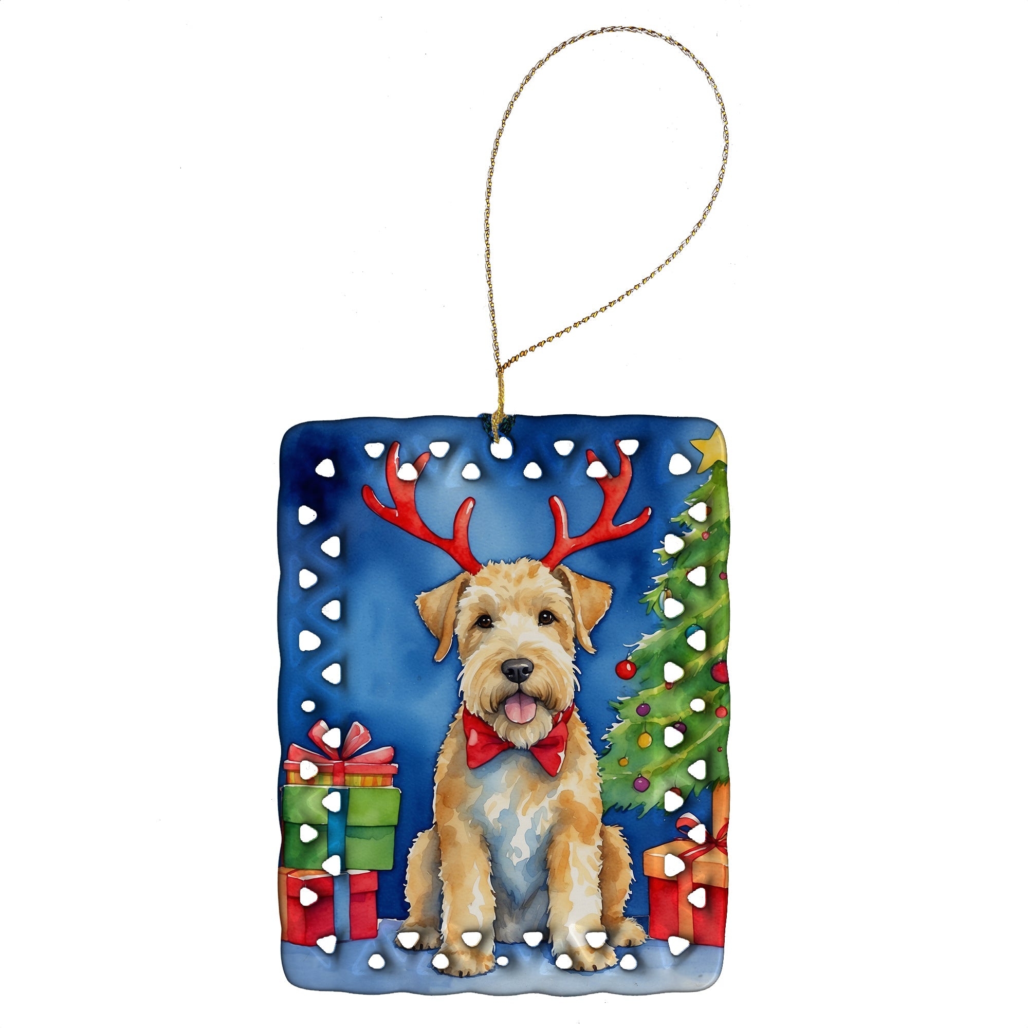 Porcelain Ornament featuring breed specific Wheaten Terrier artwork. Celebrate Christmas with this Christmas Ornament. Add a unique, personal touch to your holiday decor with our Rectangular Lattice Porcelain Ornament. Perfect for creating cherished memories, this high-quality ornament shines under festive lights, reflecting warmth and joy throughout your Christmas tree. Crafted with a glossy finish, it showcases vibrant, full-color artwork contributed by our talented artists, ensuring your tree is adorned with a burst of color and holiday spirit. What sets this Porcelain Ornament apart is its customizable white back. Use a paint pen or permanent marker to write a heartfelt message, commemorate a special year, or mark an unforgettable date, turning this ornament into a keepsake that will be treasured for years to come. For best results, allow any personalization to dry thoroughly before handling. Each ornament comes complete with a delicate gold cord, making it easy to hang and display. Proudly made in the USA, this ornament measures 3.375 x 2.625 inches and is a thoughtful gift for pet sitters, teachers, family members, or anyone who would appreciate a little extra holiday magic. Bring style, charm, and a touch of personal meaning to your Christmas tree with this beautifully designed ornament..