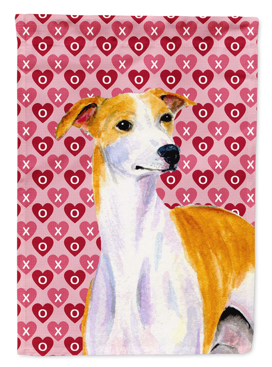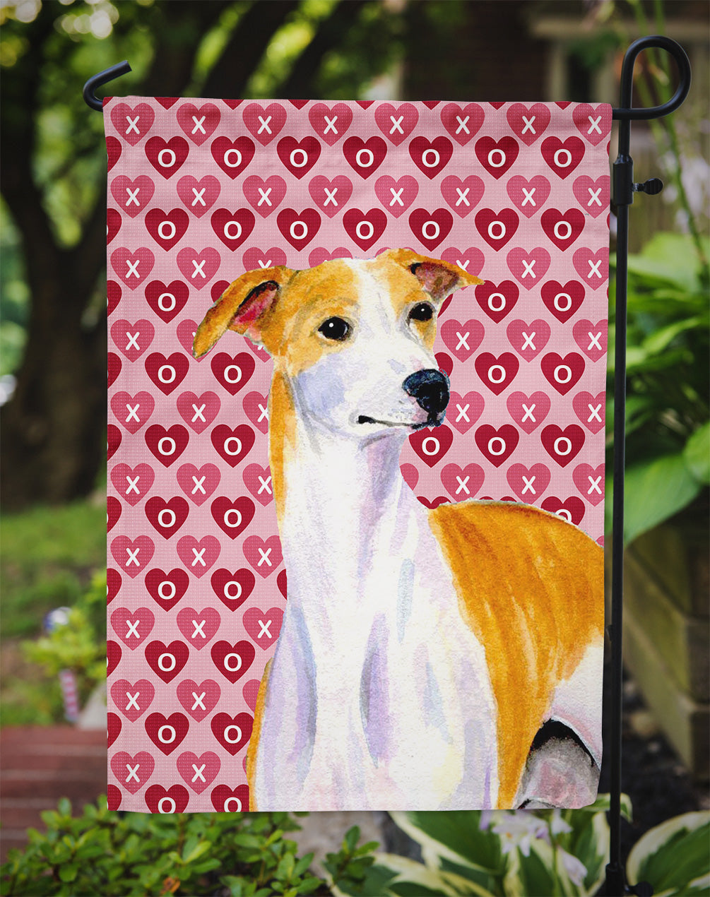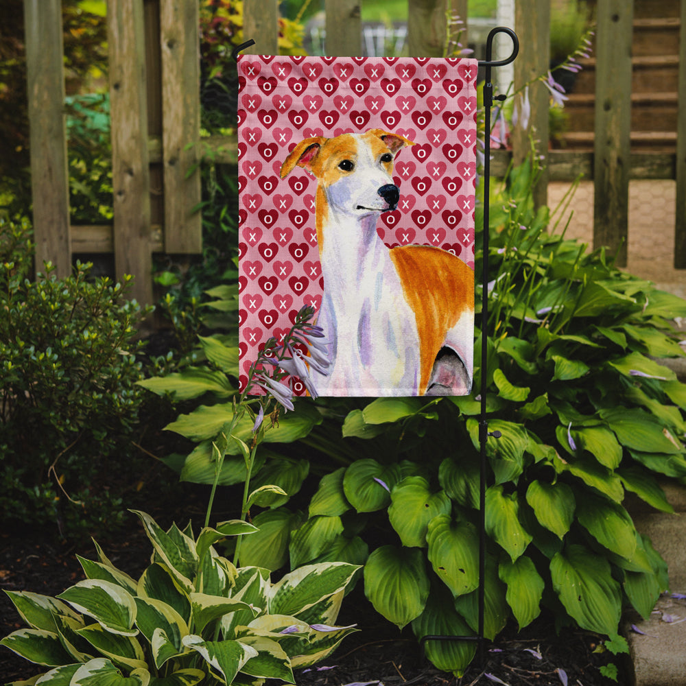 Decorate your space with our Valentine's Day Whippet artwork on a Garden Flag. Enhance the beauty of your garden, patio, or yard with Caroline's Treasures Decorative Garden Flag, proudly made in the USA. Crafted from two pieces of thick, double-sided polyester fabric, this 2-ply garden flag is designed to withstand various weather conditions, making it water-resistant and weatherproof. Featuring correctly readable words on both sides, this garden flag offers a delightful visual experience from any angle. With its heavier weight, it stands out among other garden flags, ensuring stability and durability even in wind, rain, and snow. Measuring approximately 11 1/4 inches by 15 1/2 inches, this flag allows you to personalize your outdoor decor. It comes with a 1 1/2-inch sleeve sewn in, allowing easy attachment to any standard garden flag stand or garden size porch hanger (sold separately). Make a statement in your outdoor space with Caroline's Treasures Decorative Garden Flag, a vibrant and high-quality flag that adds color and personality to your surroundings. Proudly made in the USA, it's a symbol of quality craftsmanship and attention to detail.