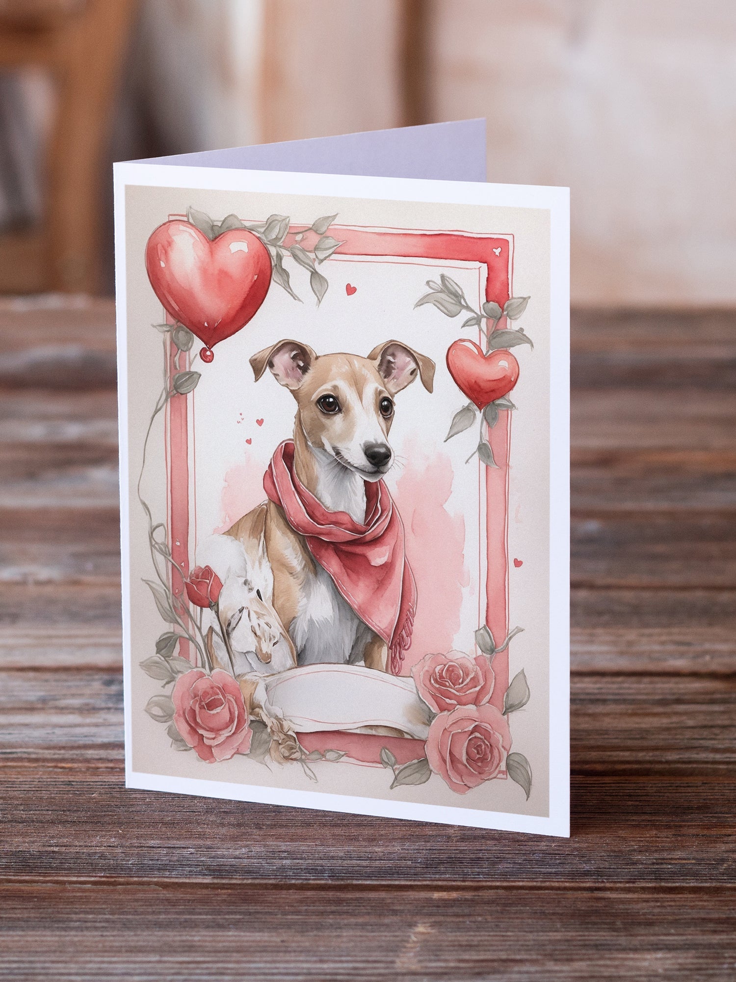 Decorate your space with our Valentine's Day Whippet artwork on a . Celebrate special moments with Caroline's Treasures Printed Greeting Card Pack. This pack includes eight beautifully folded 5x7 cards, accompanied by eight matching white envelopes. With blank interiors, these cards provide ample space for your personalized messages and heartfelt holiday greetings. Each card features captivating full-color artwork, meticulously printed in our facility on high-quality 80 lb cover stock or 216 GSM. The super smooth finish of the white cards enhances the visual impact of the artwork, creating a truly stunning presentation. Designed by our talented in-house artists or licensed artists, the artwork on these cards showcases their creativity and attention to detail. From vibrant illustrations to captivating designs, each card tells its own unique story. Whether it's for birthdays, anniversaries, holidays, or any special occasion, Caroline's Treasures Greeting Card Pack is the perfect way to convey your heartfelt sentiments. Share joy, love, and warm wishes with these exquisite cards and make every moment unforgettable.