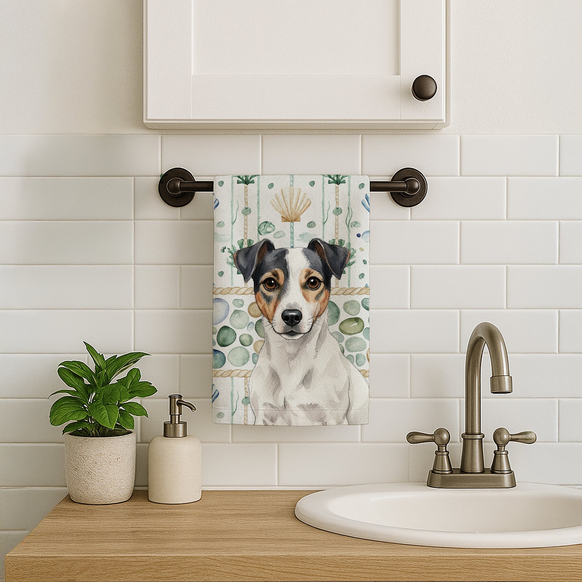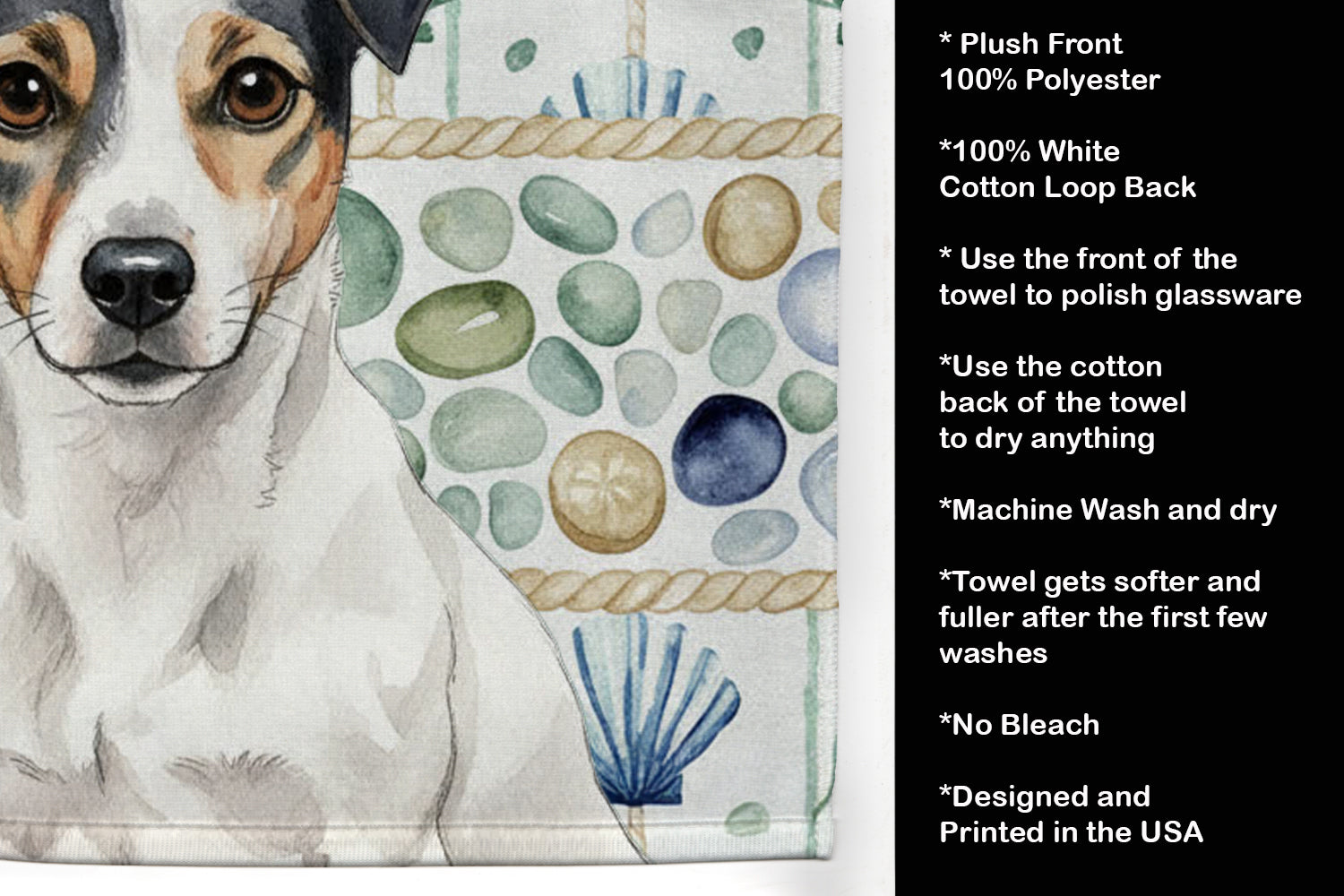 Kitchen Towel featuring breed specific Jack Russell Terrier artwork. Bring breezy coastal charm to your kitchen or bath with our plush velour towel featuring original watercolor artwork. The soft minky polyester front showcases vivid seashell and starfish designs with a dog portrait, perfect for polishing glassware to a brilliant shine. The 100% cotton terry loop back delivers superior absorbency for drying hands, dishes, or counters. Artwork is dyed directly into the fibers for lasting color that won’t crack or peel. Each towel measures 15" x 25", with bound edges to maintain shape after repeated washes. Machine washable and tumble dry low for easy care. Designed and printed in the USA, these towels combine function and style—ideal for beach homes, coastal kitchens, or as thoughtful gifts.